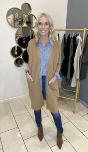 6. Paisie ribbed cardi camel, essential shirt stripe blue, 1981 Skinny medium wash.