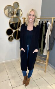 5. Paisie Ribbed cardi black, essential modal long sleeve top, 1981 skinny medium wash.