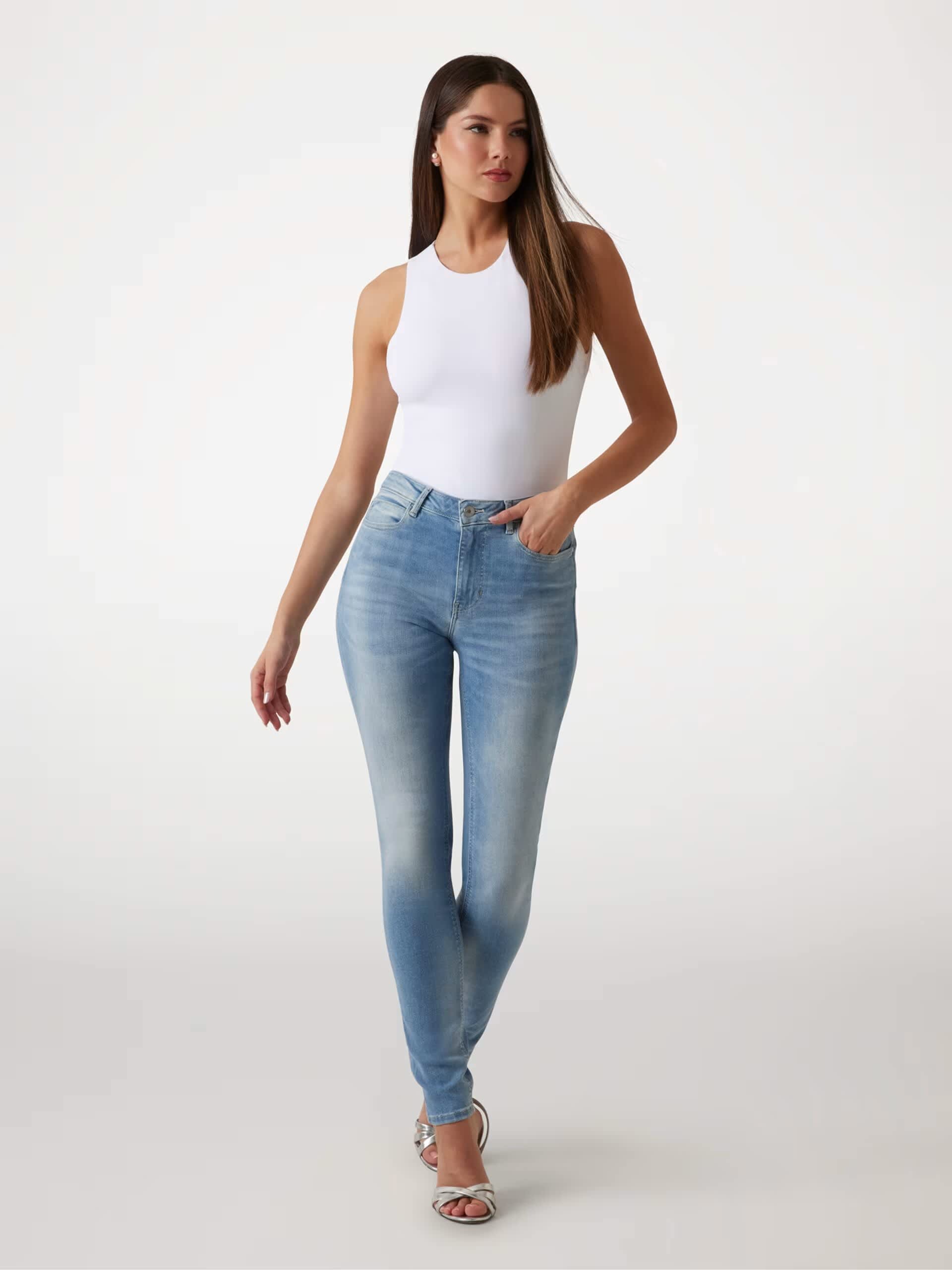 Cotton blend denim pants. Classic 5-pockets. High rise, skinny leg. Front button and zip fastening. The perfect light wash jean for spring summer season!
