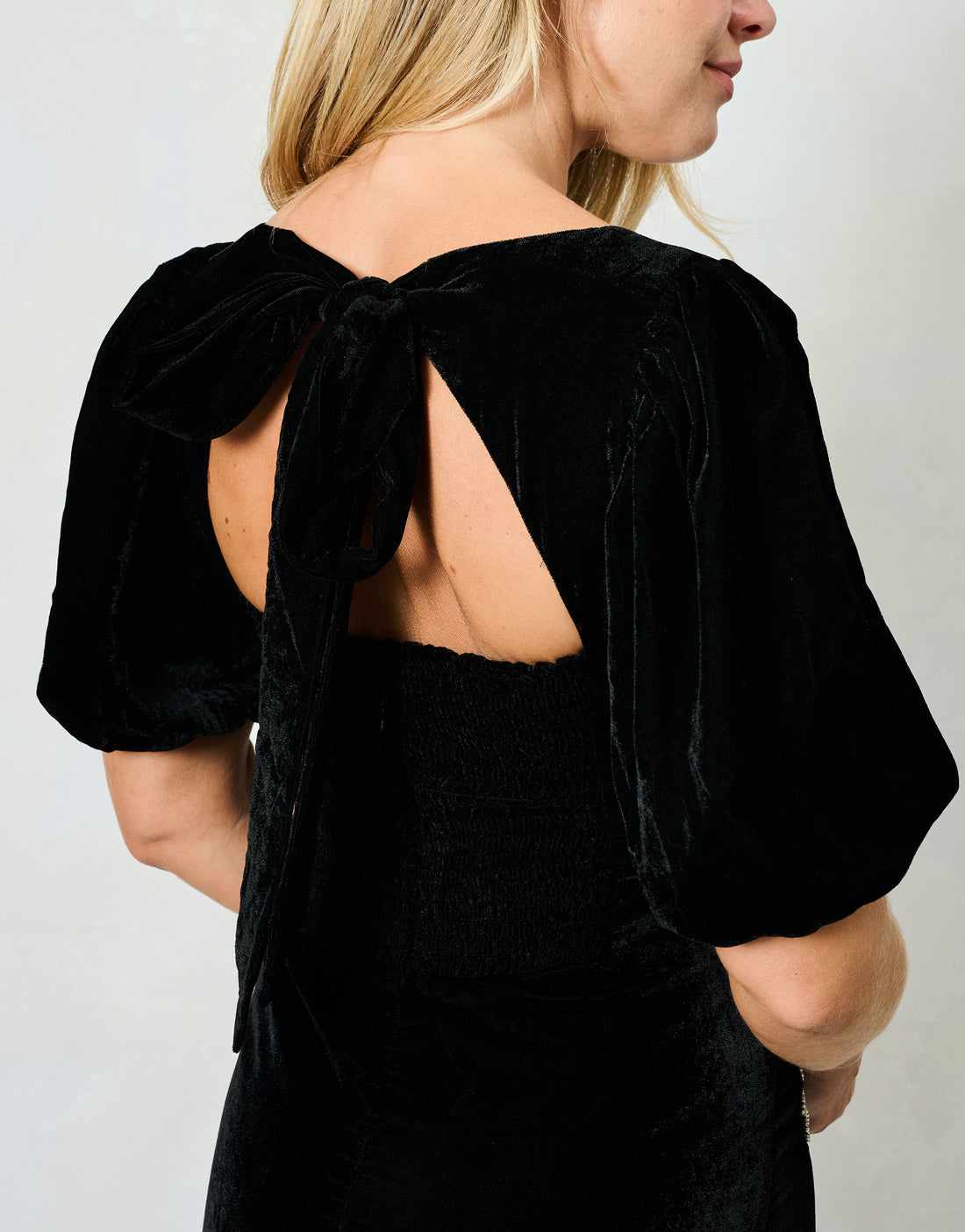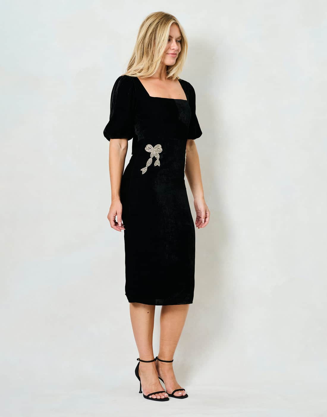 Hope & Ivy’s stunning The Alba dress is crafted from plush black velvet with sparkling beaded bow embellishments at the waist for a playful feel. This midi-length style is cut to a flattering pencil silhouette with a shirred back waist panel and back vent for comfortable movement. We love how the glittering adornments are echoed by the thoughtfully placed bow tie at the nape of the neck.