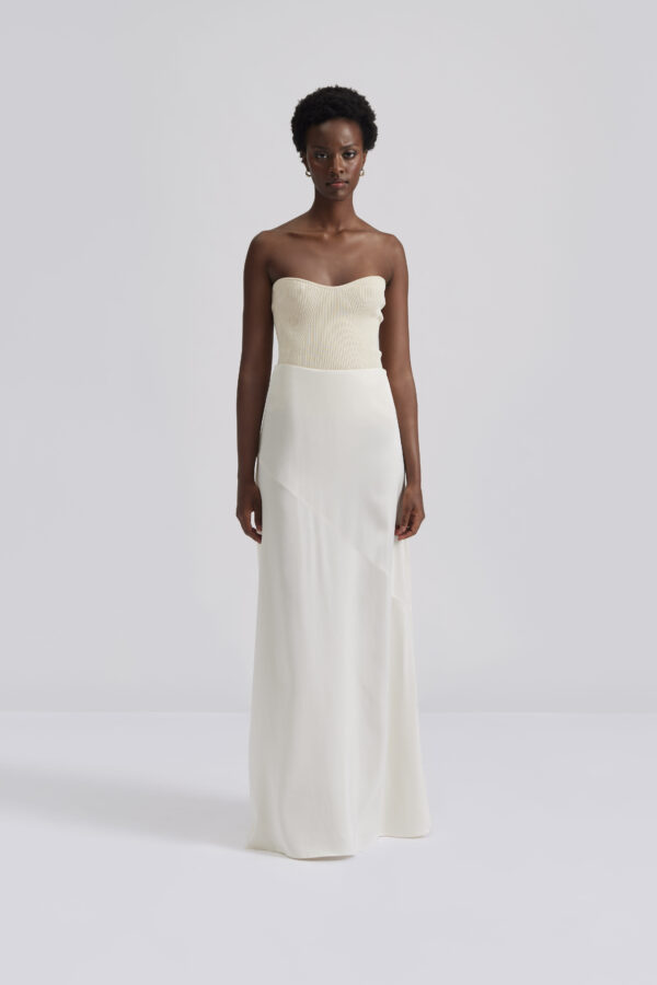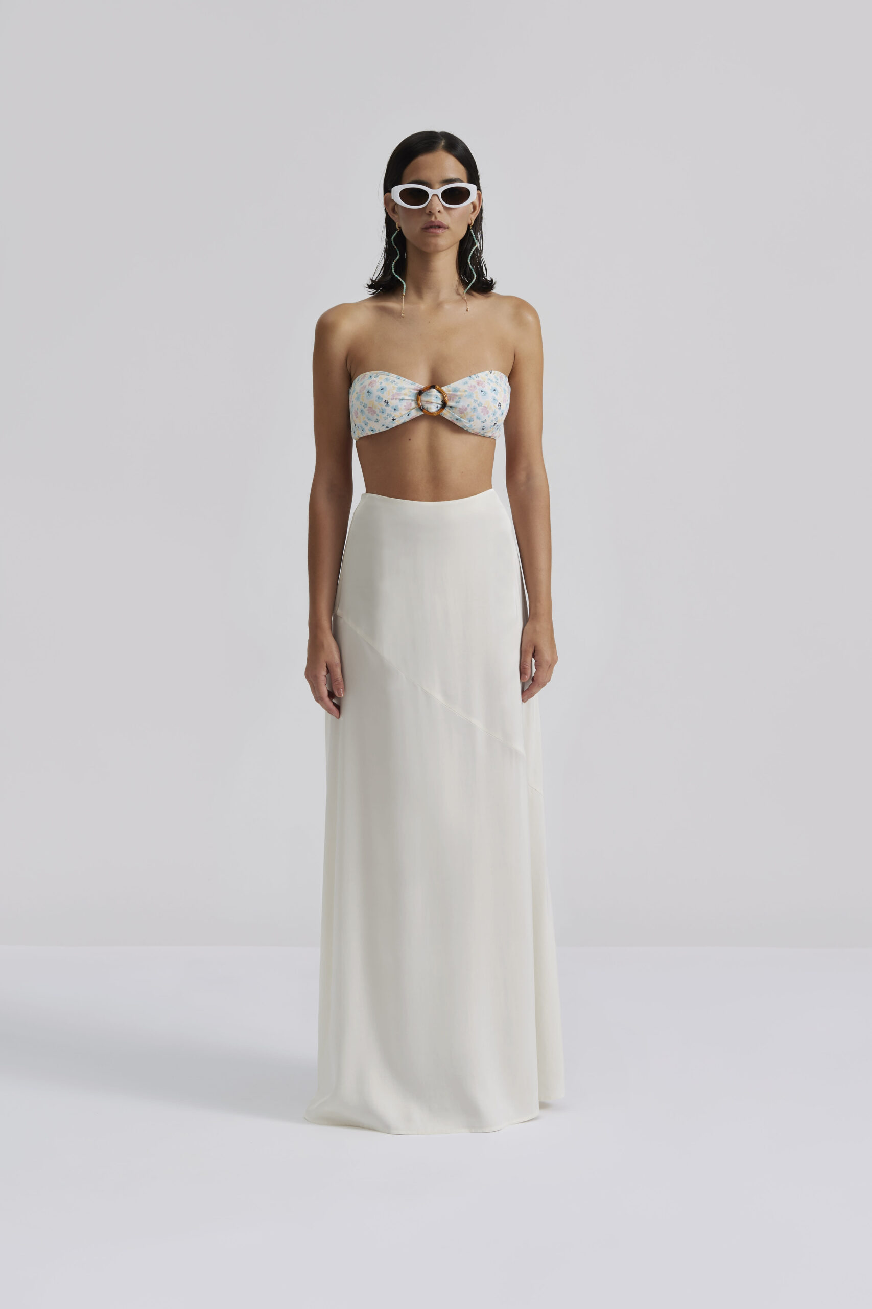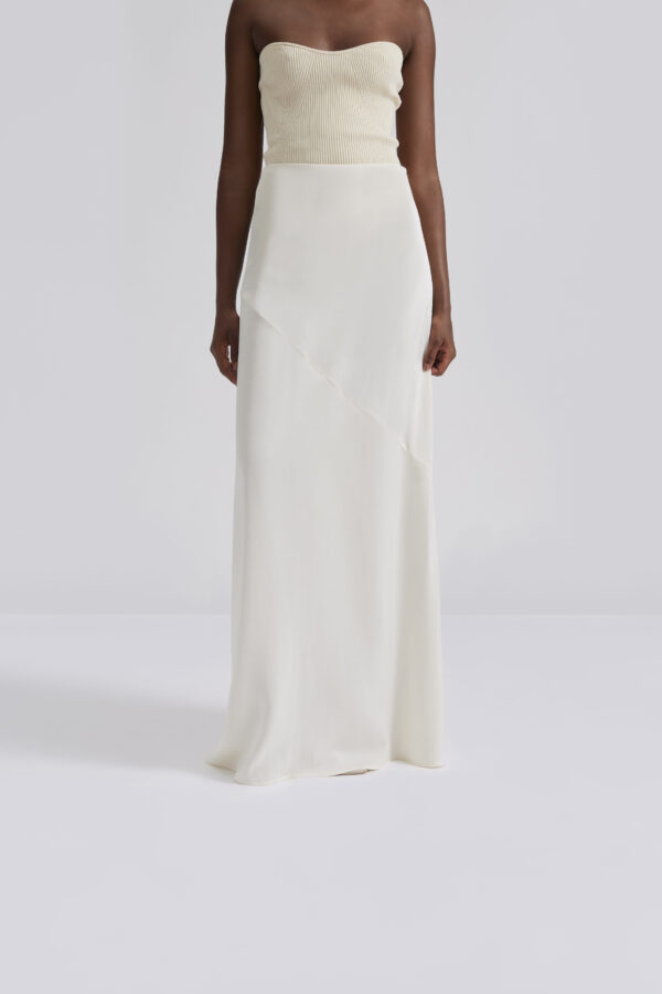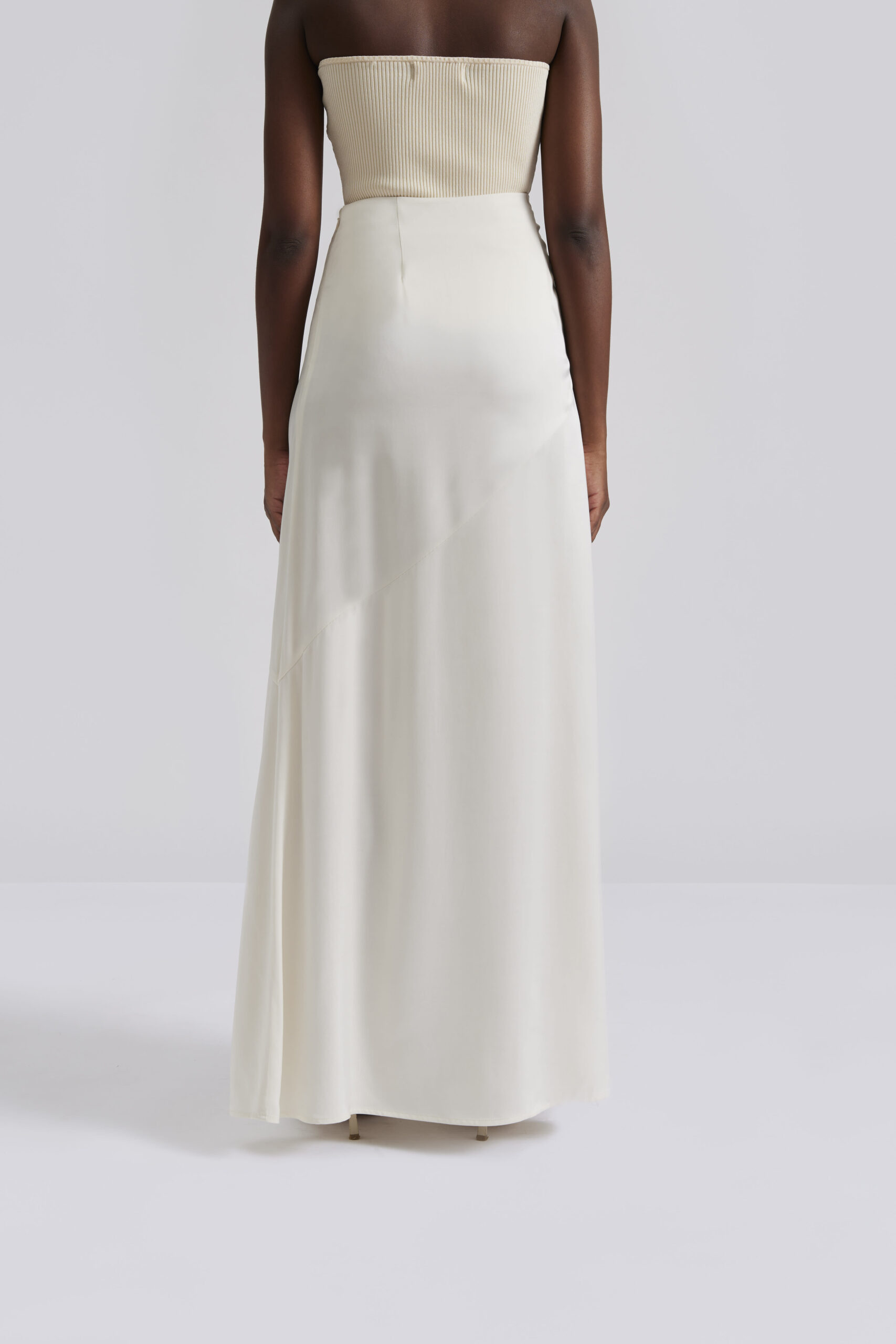 This stunning oyster satin maxi skirt has a cross seam making it fall beautifully. The skirt has an wide elasticated waist band.