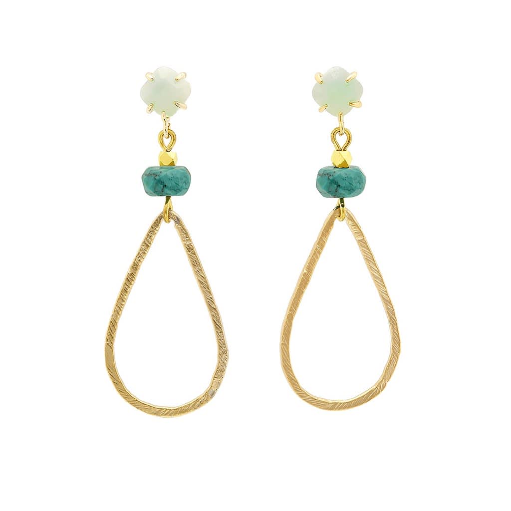 Handcrafted with faceted Amazonite stones, faceted turquoise stones and hand hammered, textured 16 k gold plated drop shaped pendants.