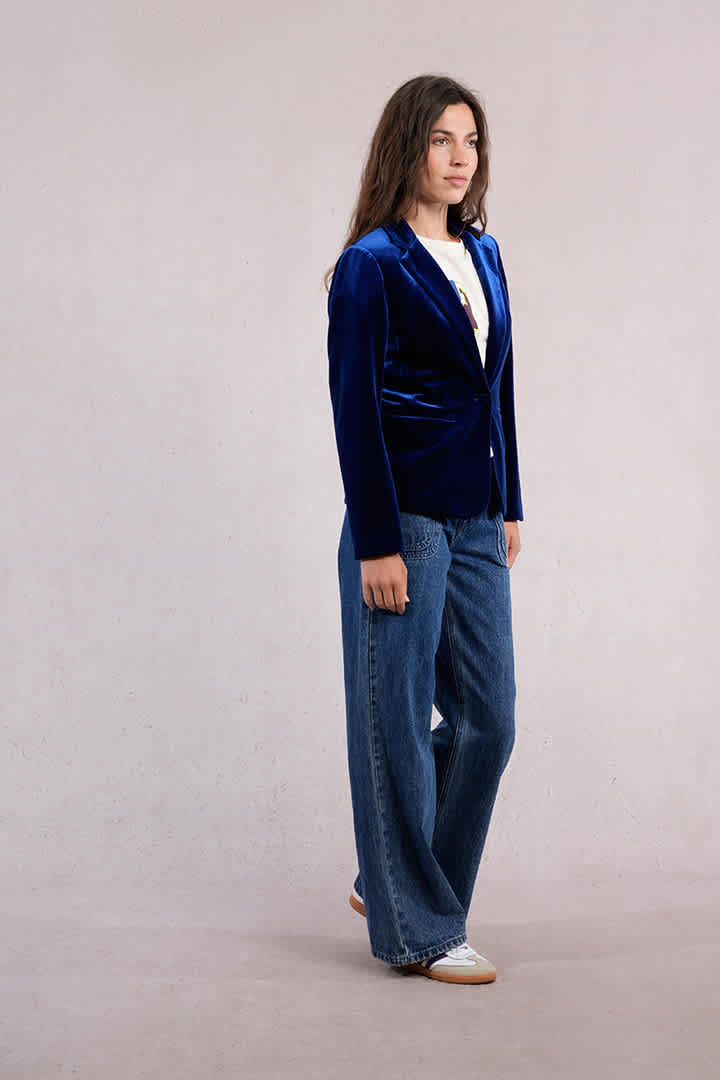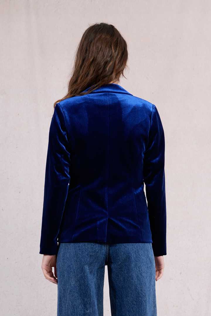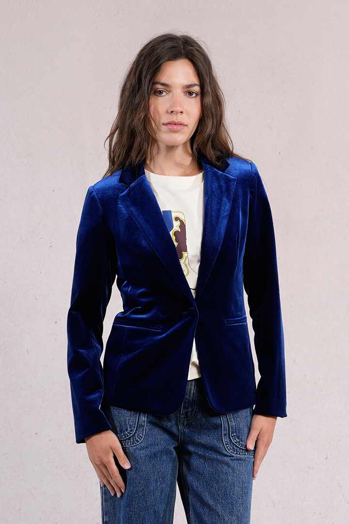 A classicly timeless look for your winter wardrobe. Soft velvet blue blazer.