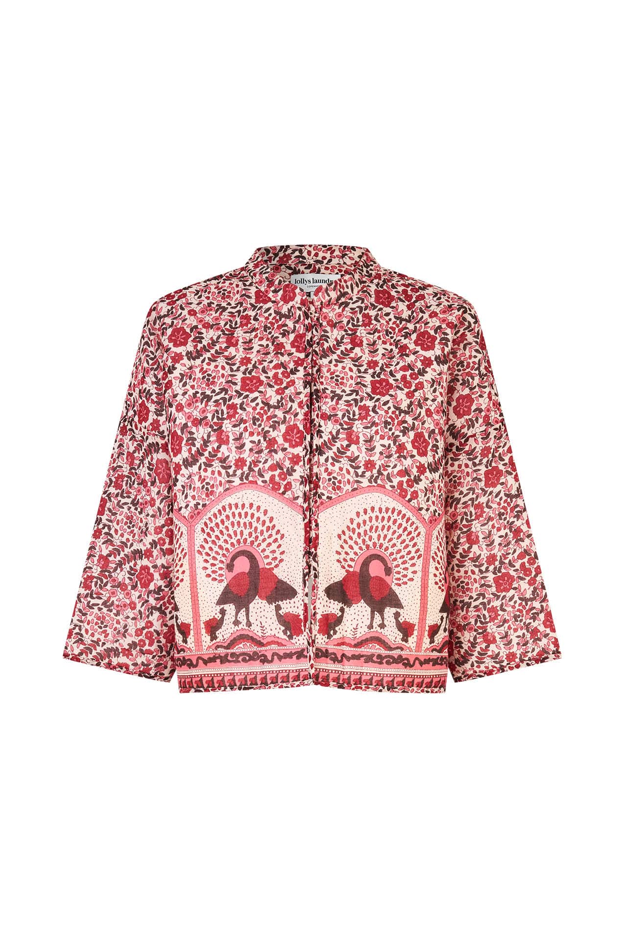 The Amby jacket is a lightly padded jacket in 100% cotton featuring a beautiful artistic print full of delicate ornamental details. The print combines florals and decorative borders, giving the jacket a distinctive and characterful look. It features a round neckline with button closure at the front and 3/4 sleeves with a soft drape. The lightweight quality and relaxed silhouette make it perfect as an extra layer over dresses, shirts and skirts.
