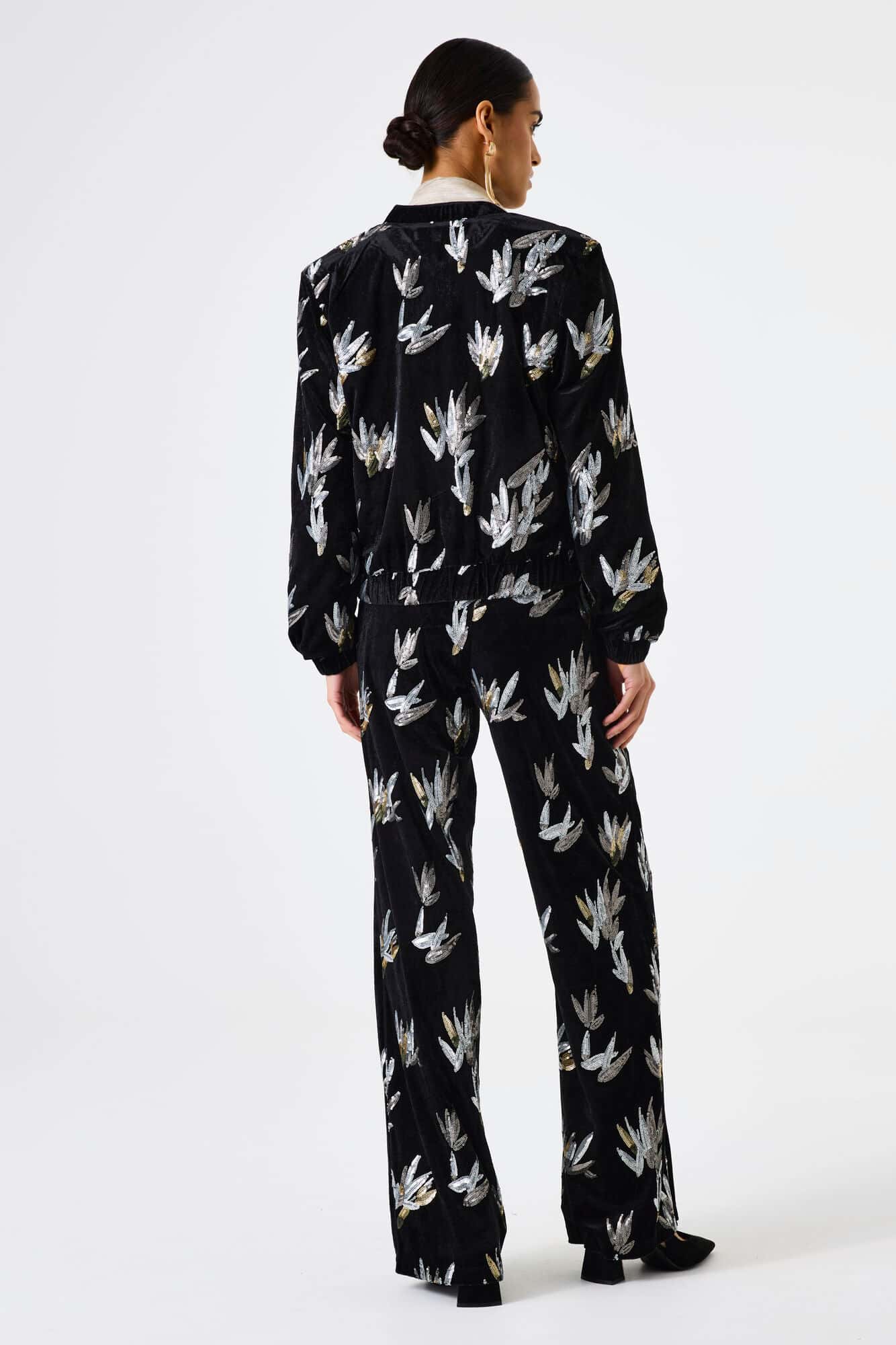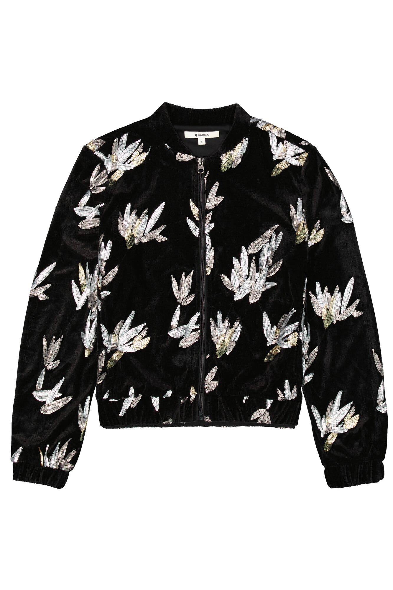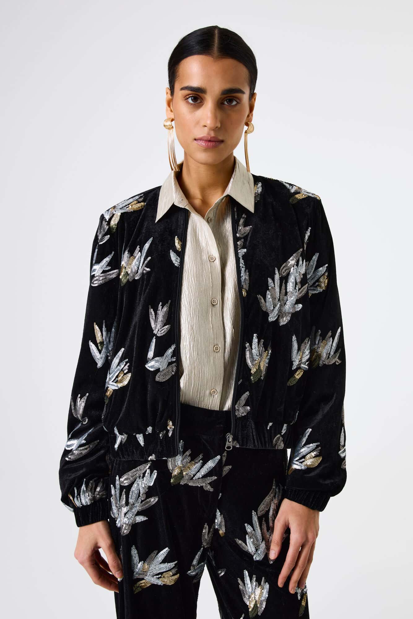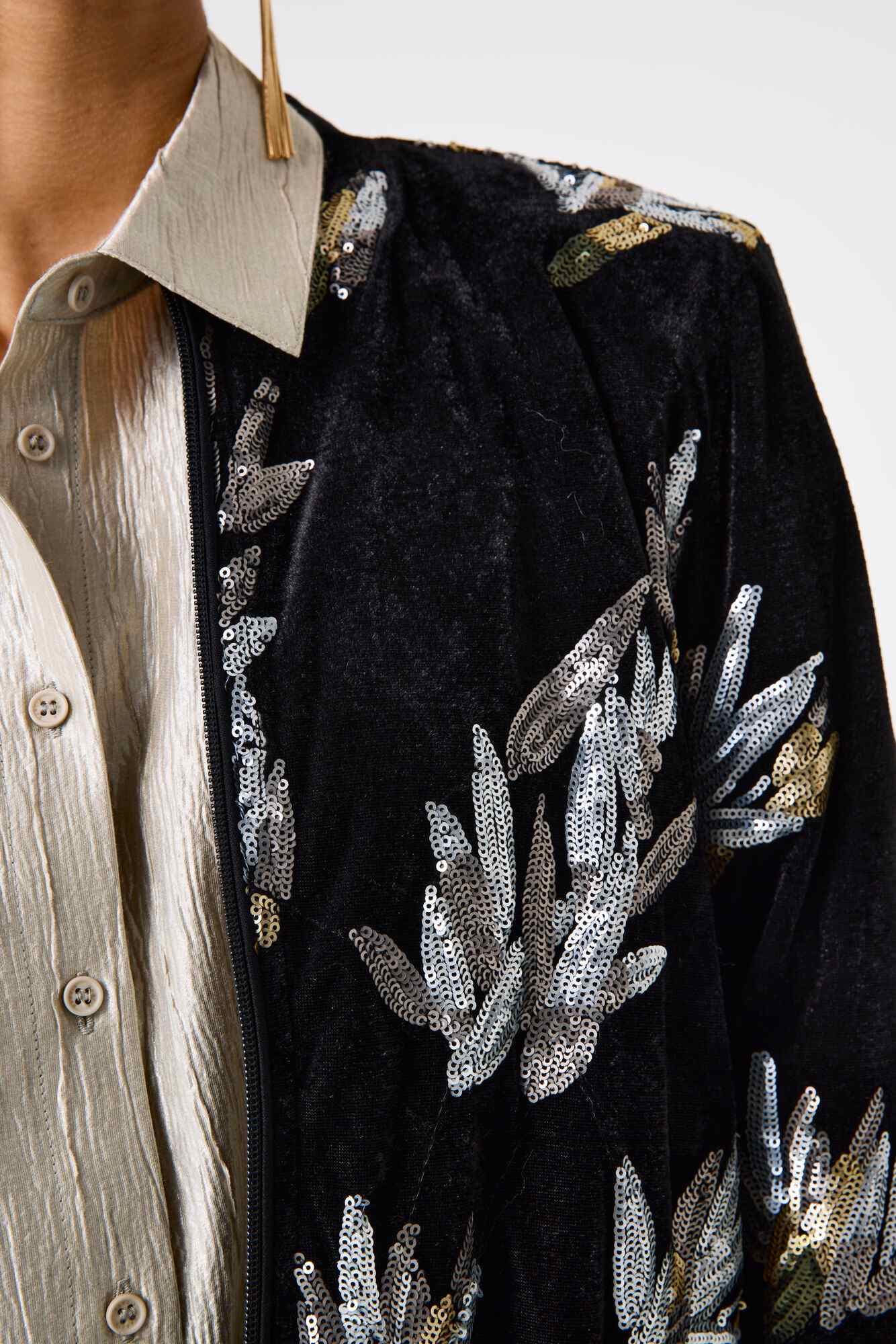 Gorgeous light weight black velvet bomber with intricate pewter toned sequin detail.