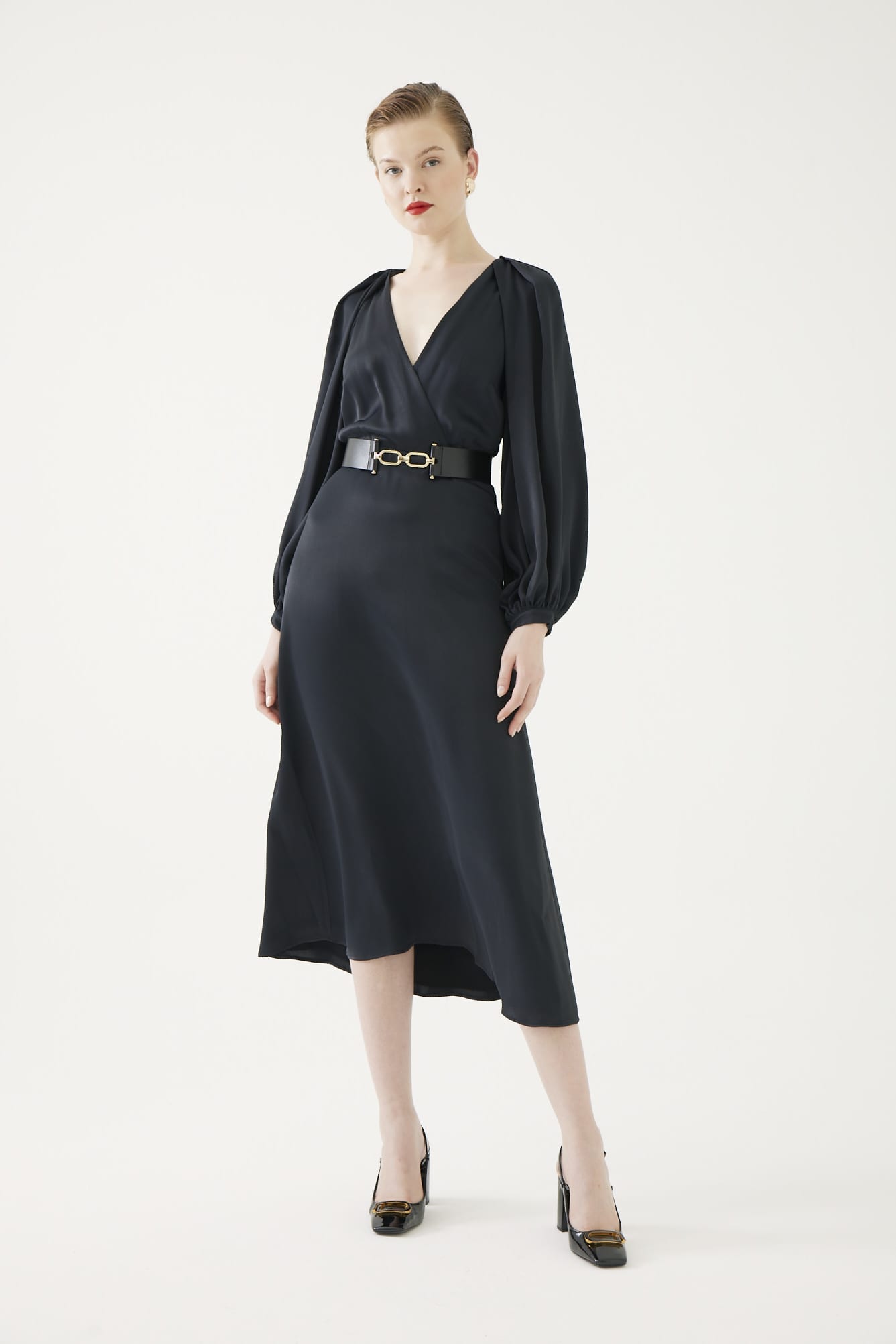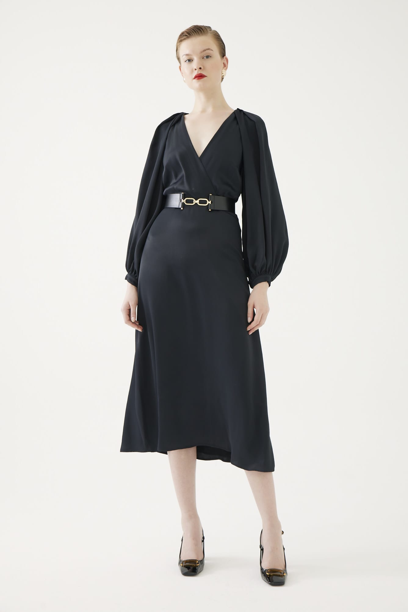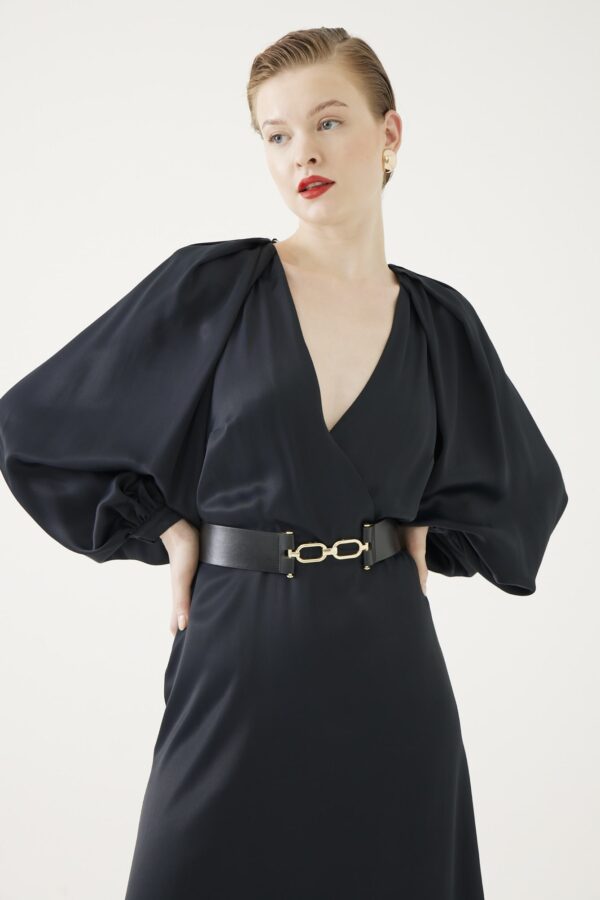 A classic little black dress. This satin a line dress has a plunging v neckline, optional belt and stunning full length sleeve. Lined.