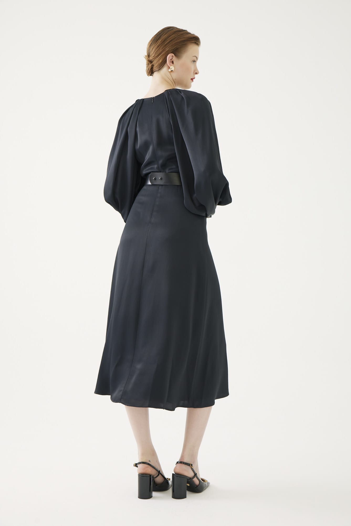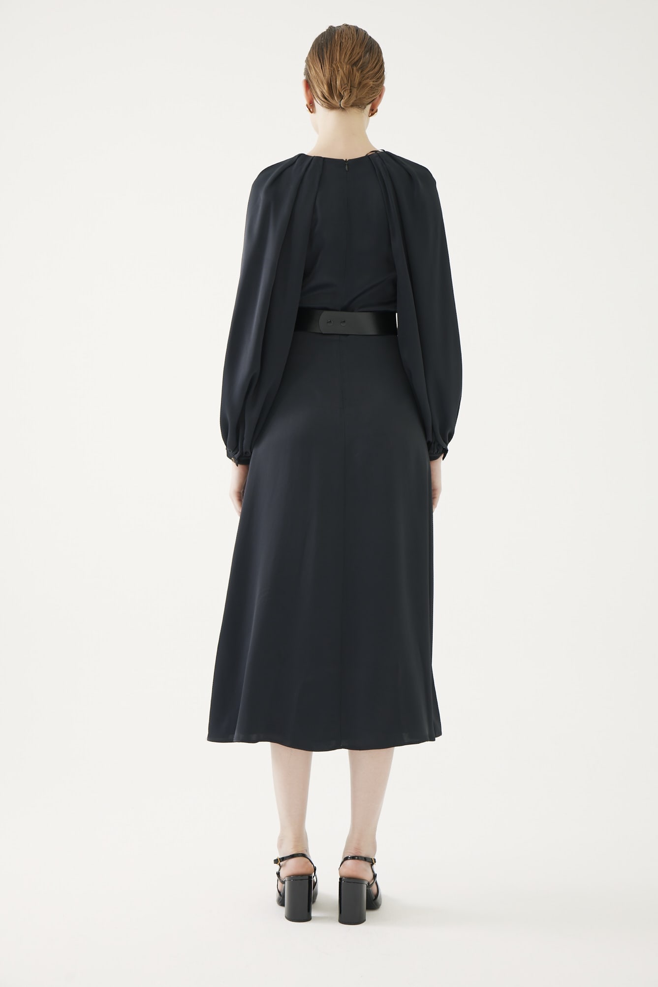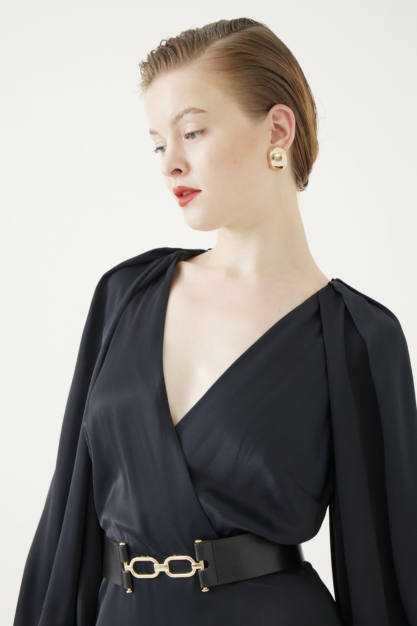 A classic little black dress. This satin a line dress has a plunging v neckline, optional belt and stunning full length sleeve. Lined.