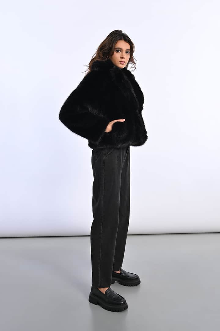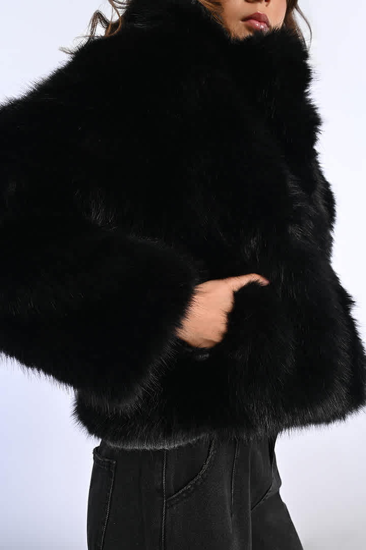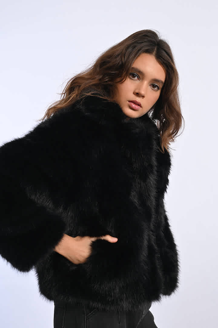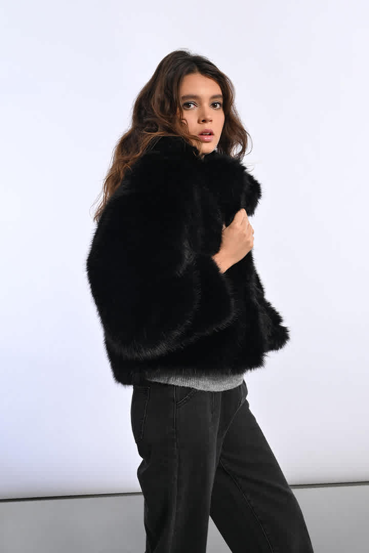 Black Faux fur jacket, Long sleeves,Wide shawl collar, Short and wide fit. Snap button closure on the middle front.