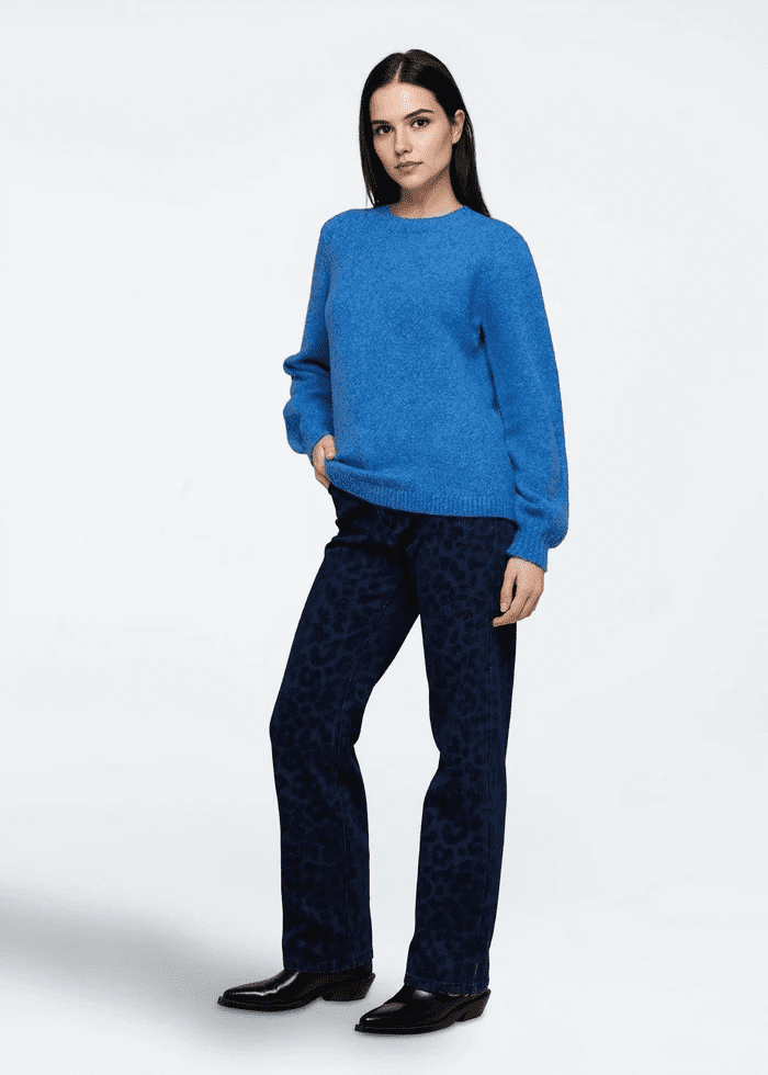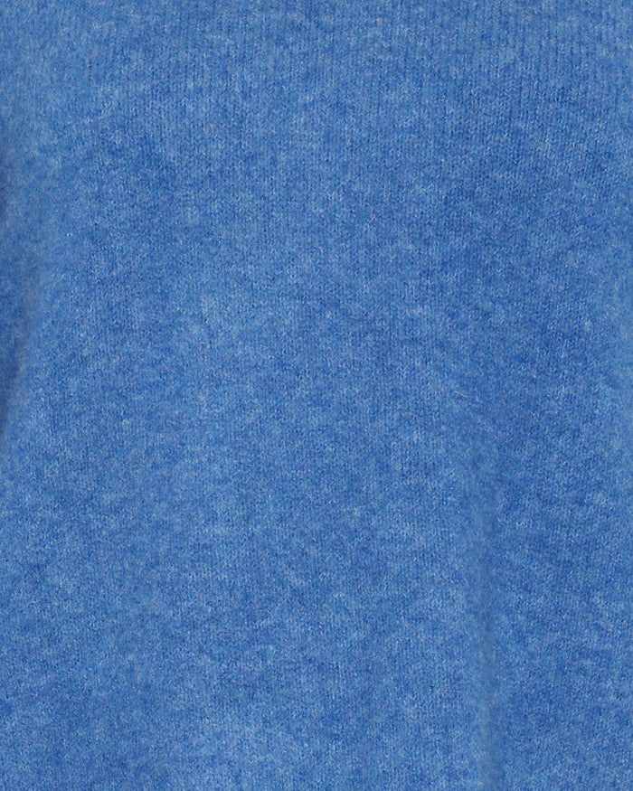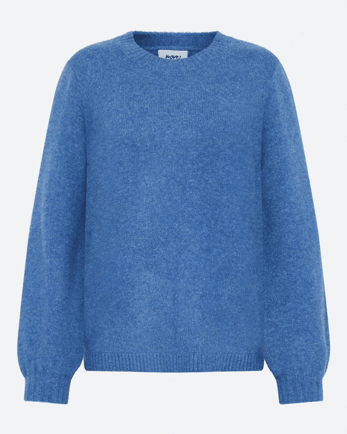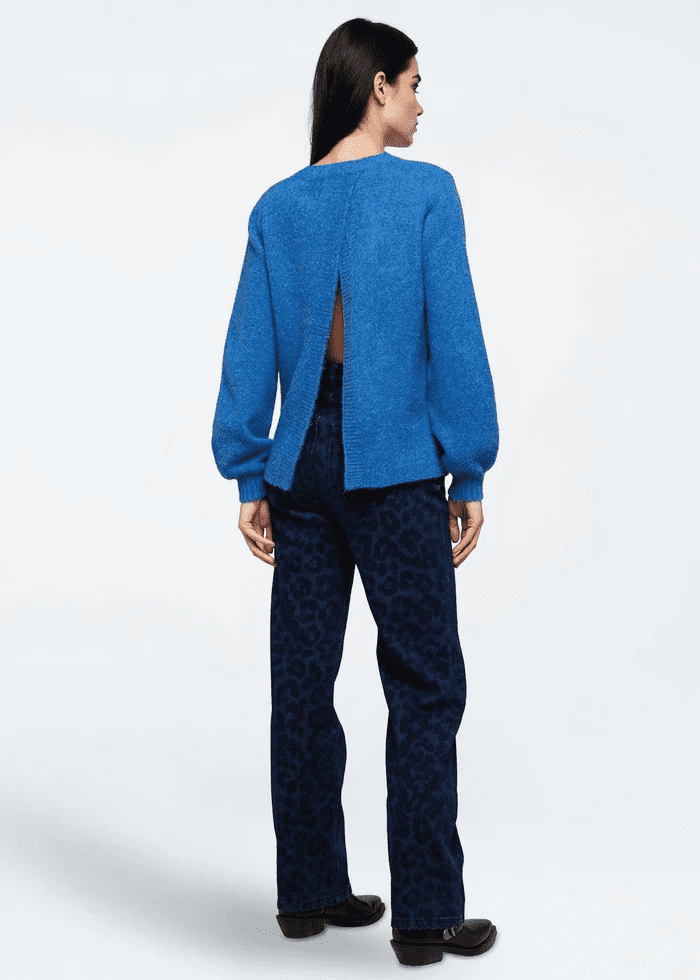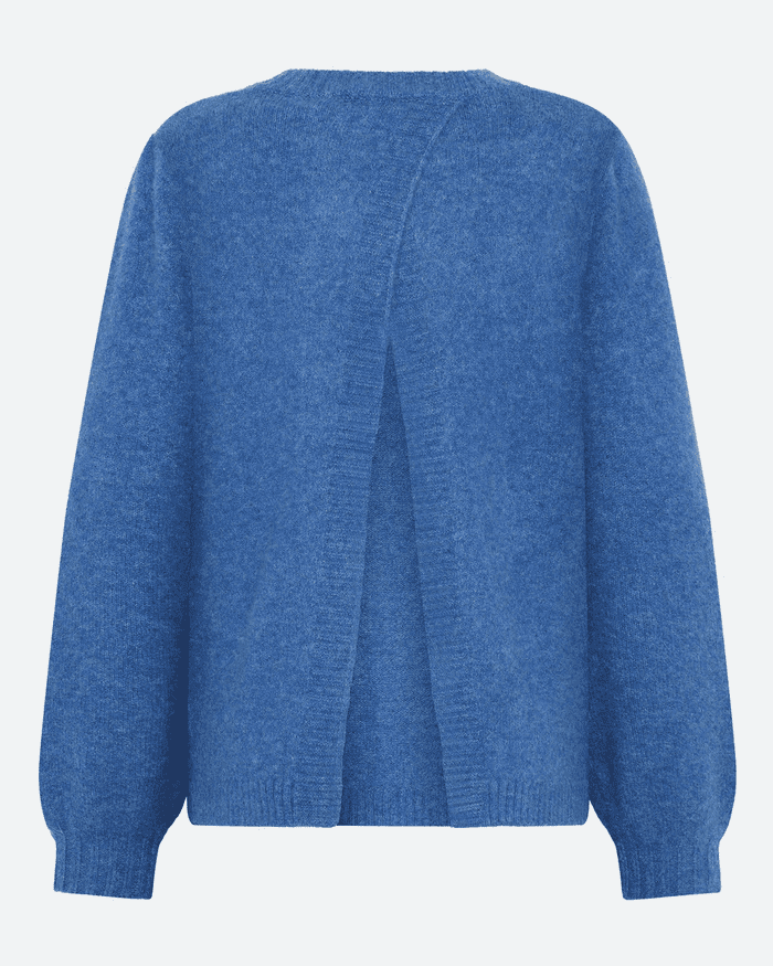 Round neck blue knit with wide sleeves that end in a cable knit cuff. This lovely soft knit has a folded open back detail.
