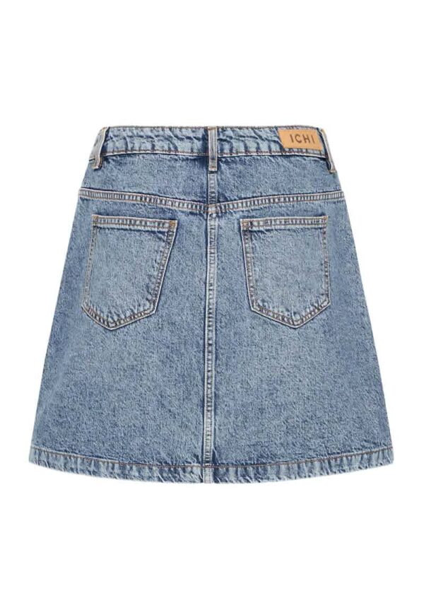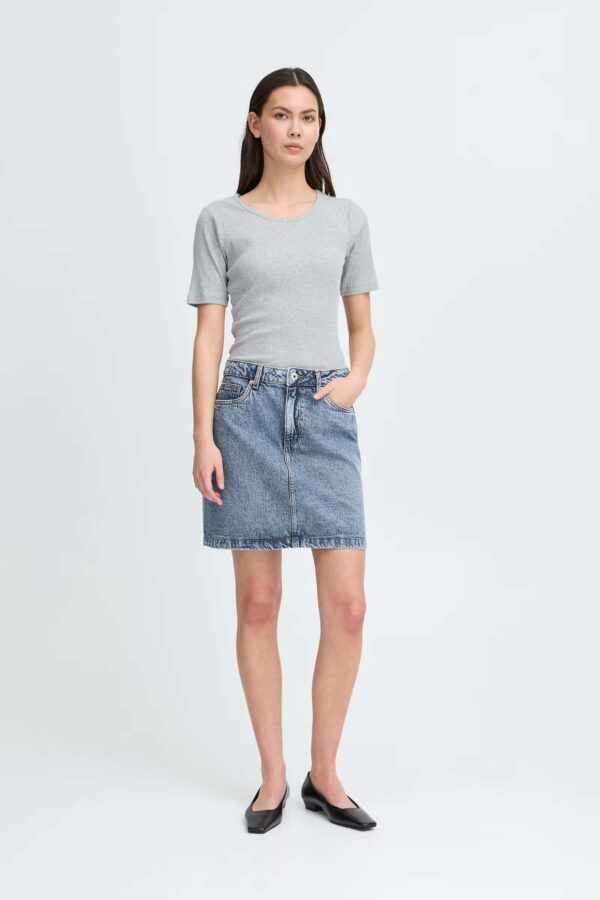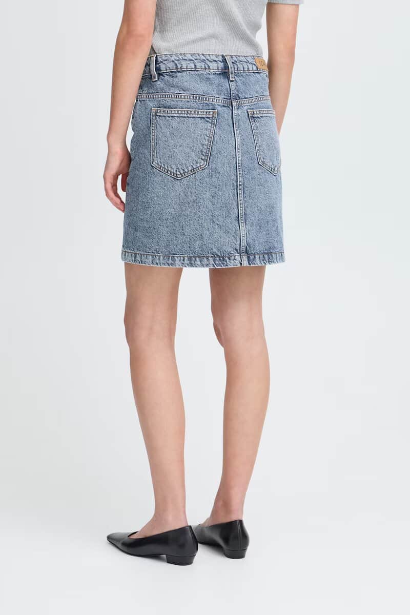 The perfect little denim skirt for summer day time style. Light acid wash blue denim.