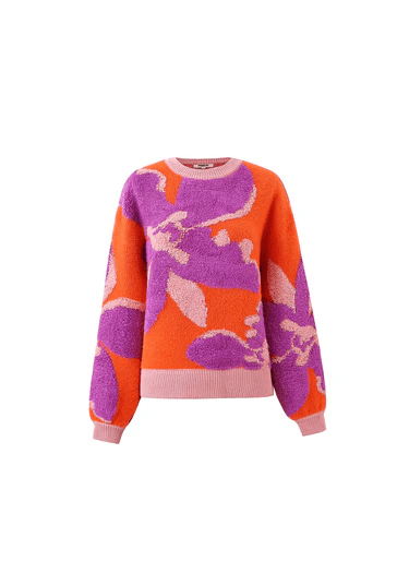 Chunky knit jumper in vibrant orange, pink and purple. The jumper has a round neck, long sleeves and a cable knit cuff, neckline and hem.
