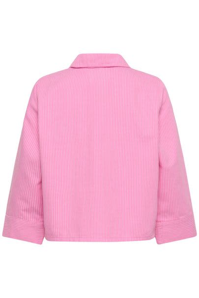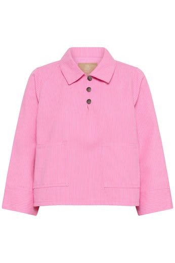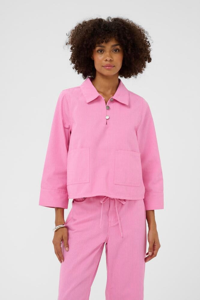 This relaxed striped top features a boxy fit, comfortable long sleeves, classic collar, buttoned half-placket, and practical front patch pockets.