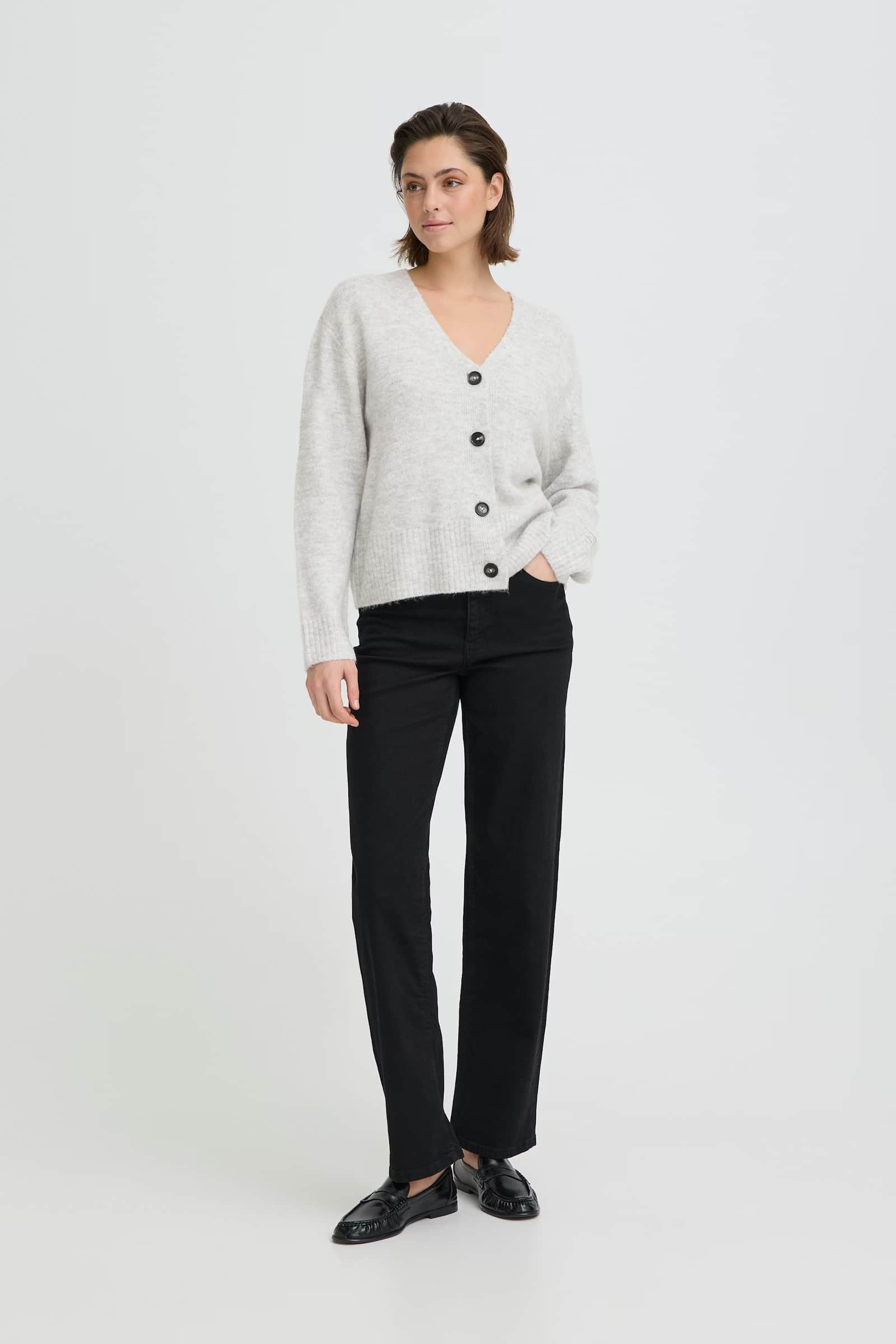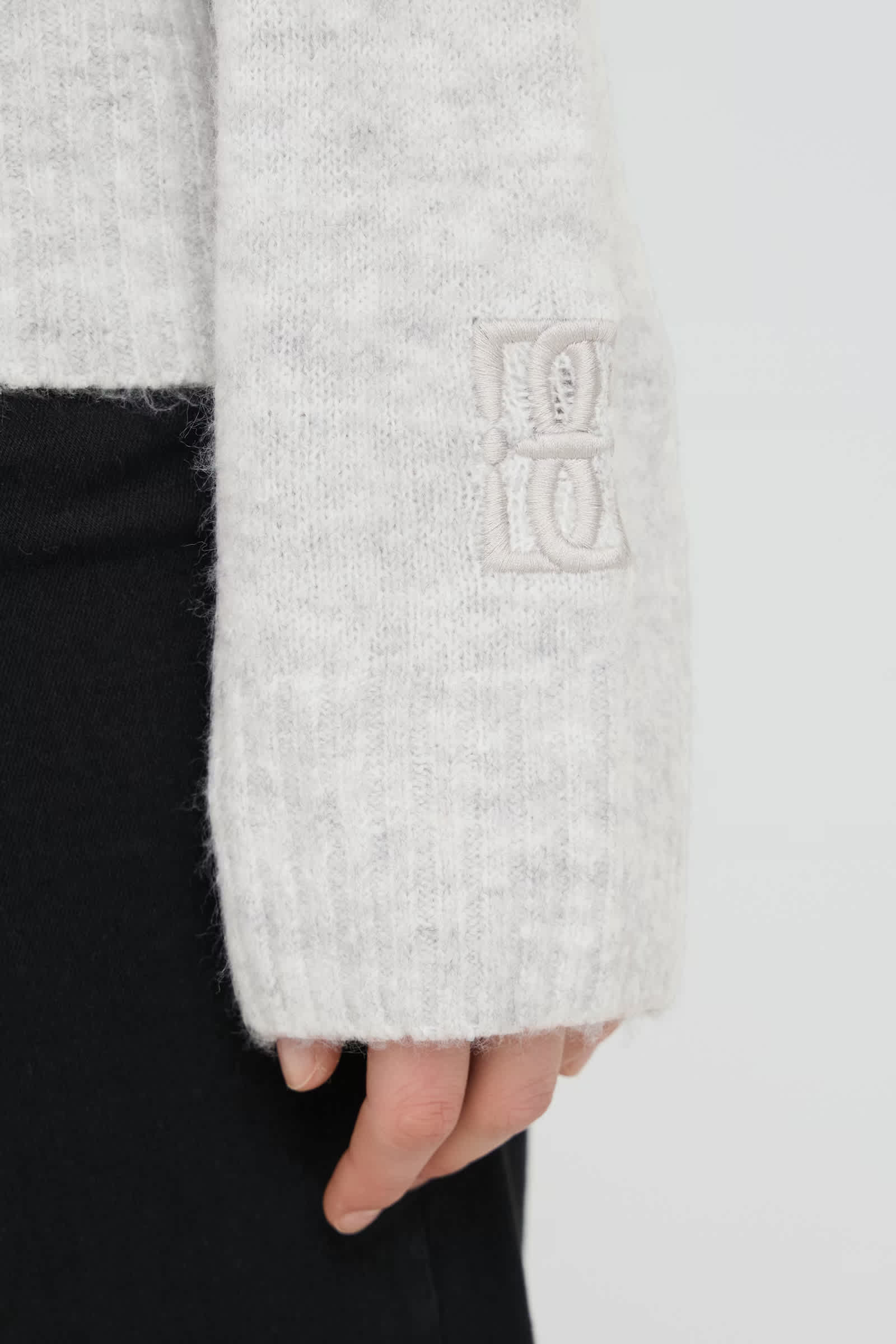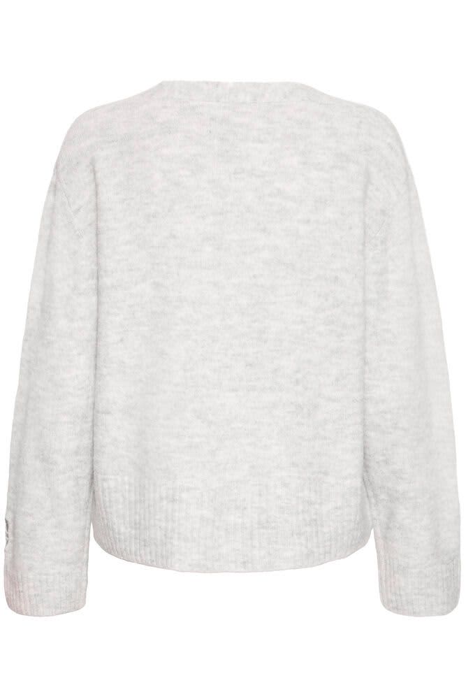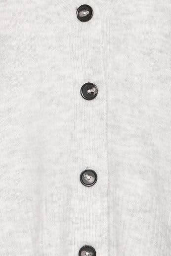 Cardigan with relaxed straight fit, V-neckline, and oversized long sleeves. Features a soft finish, large tonal buttons, ribbed hems, and subtle sleeve logo embroidery.