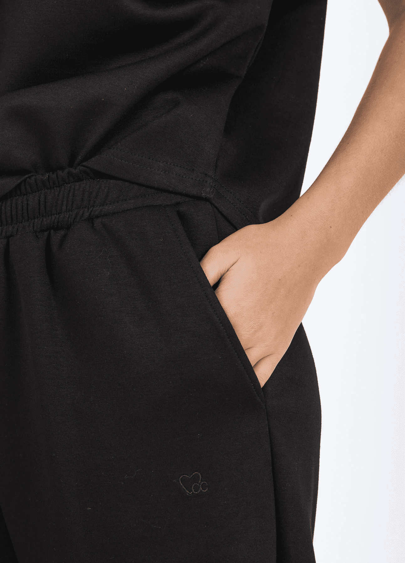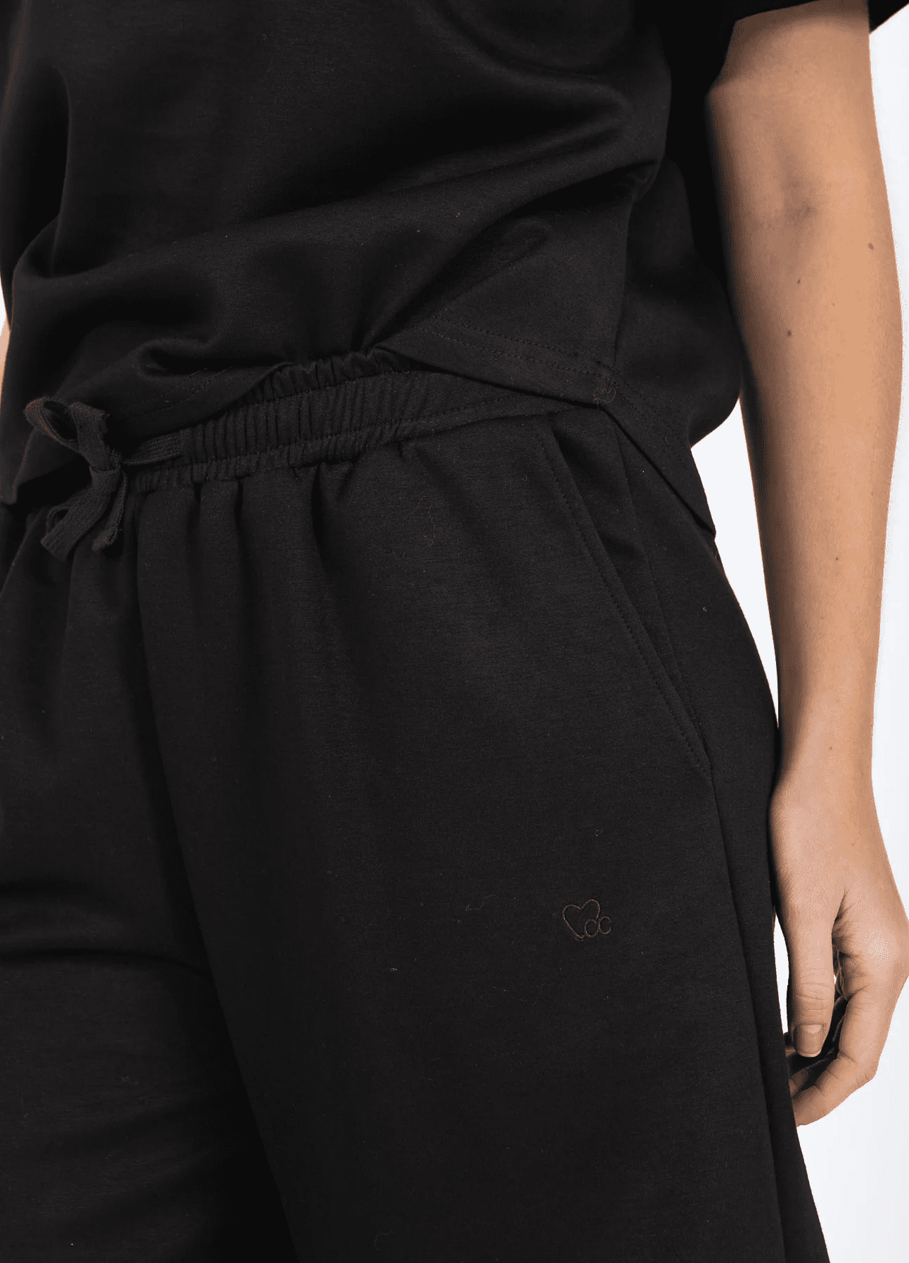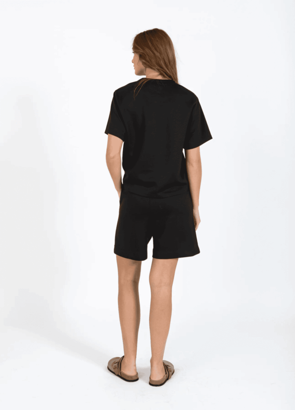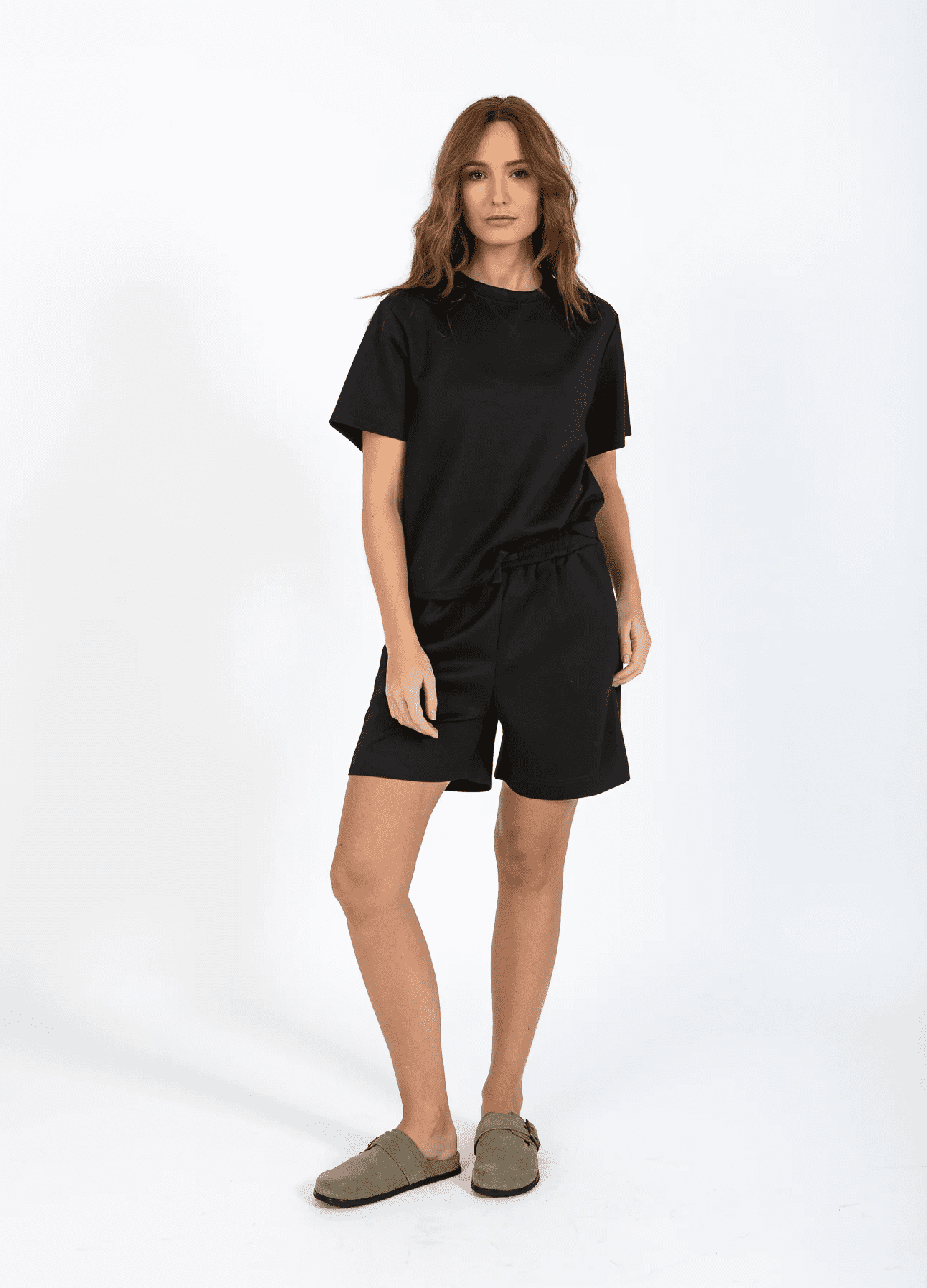 These black shorts feature an elastic waistband and laces that pull and tie.They feel so luxurious to wear. They have side pockets and sit at a flattering length on the mid thigh. Perfect shorts for a relaxed fit. Wear with matching Bea Sweatshirt Tee Black.
