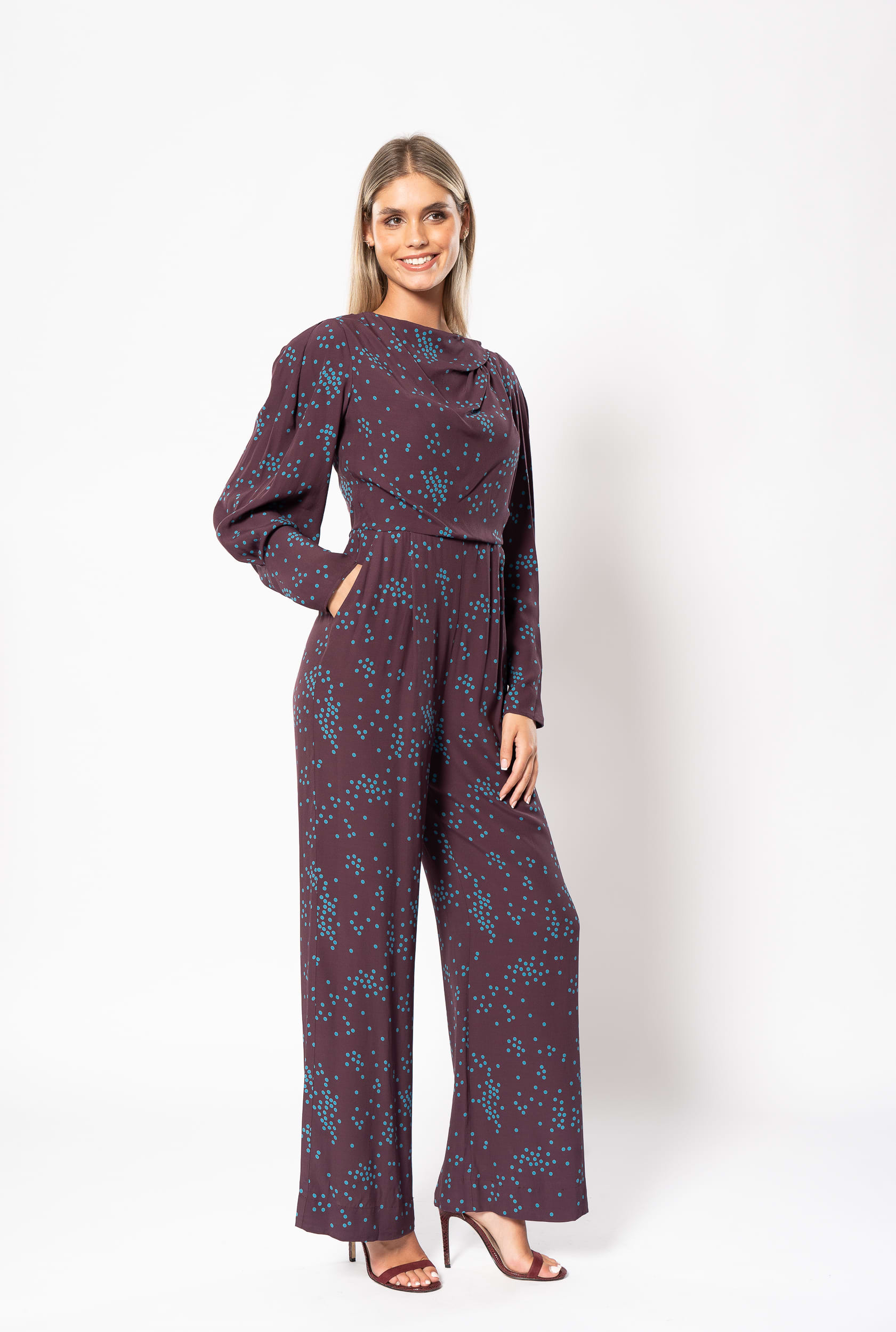 Plum wide leg jumpsuit with teal dot pattern and long sleeves. The jumpsuit has a draped round neck with a sash hanging from the shoulders that finishes with a blue disc.