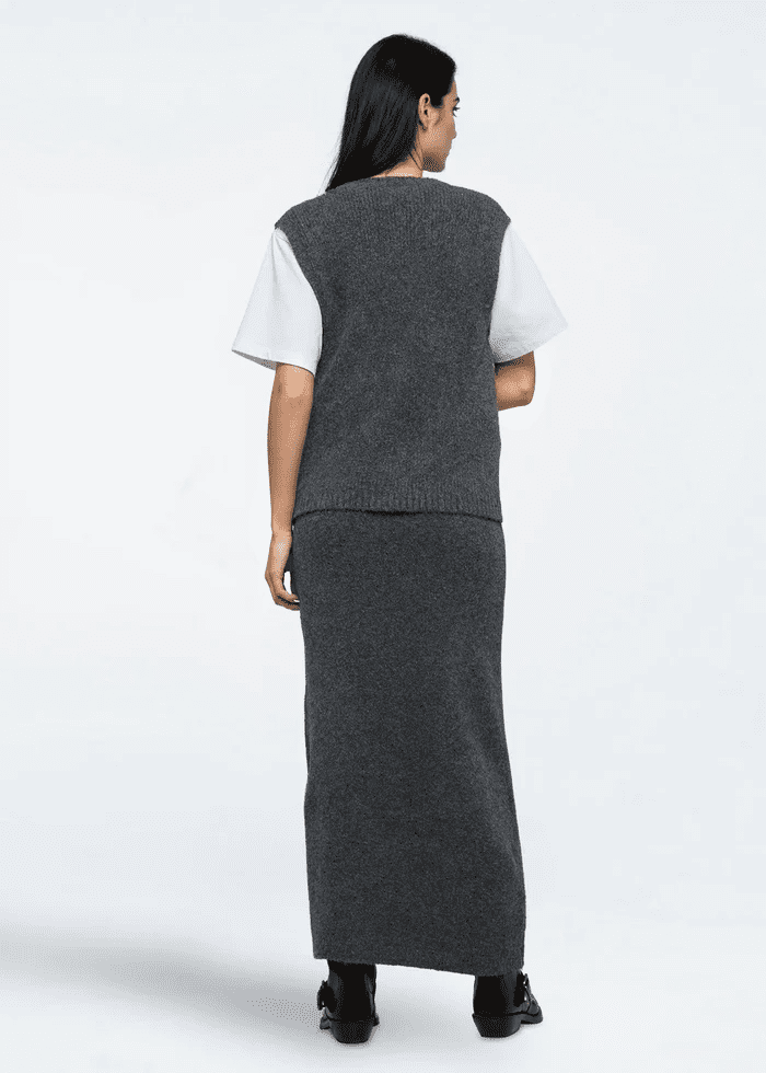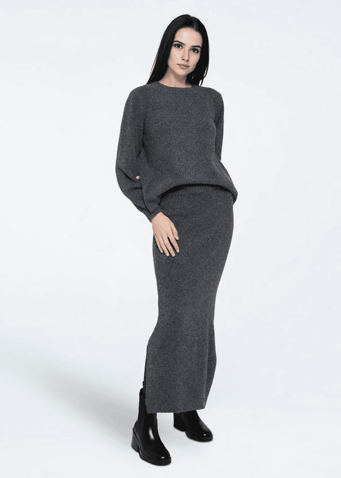 Beautiful dark grey, soft knit skirt which will keep you both cosy and stylish this Autumn/Winter. The skirt is midi length and has a side slit. The skirt makes a perfect co-ord outfit with the Asla Open Back Knit Grey