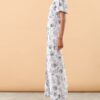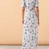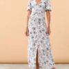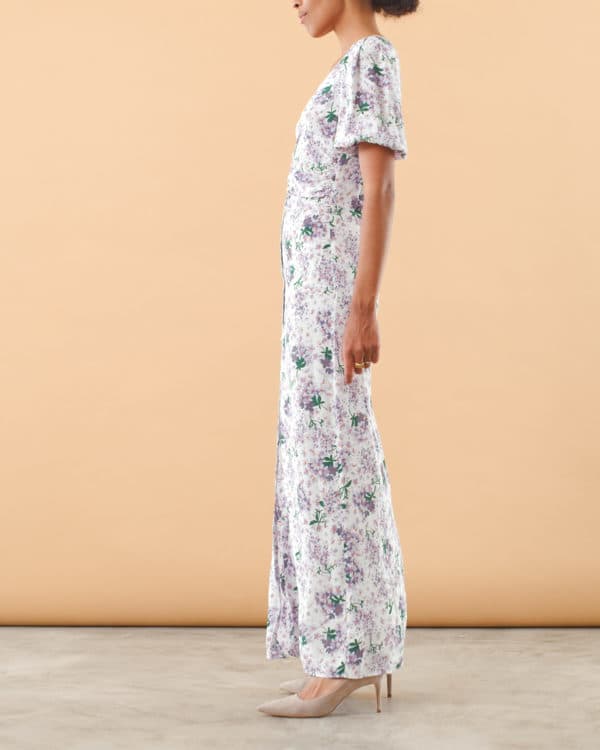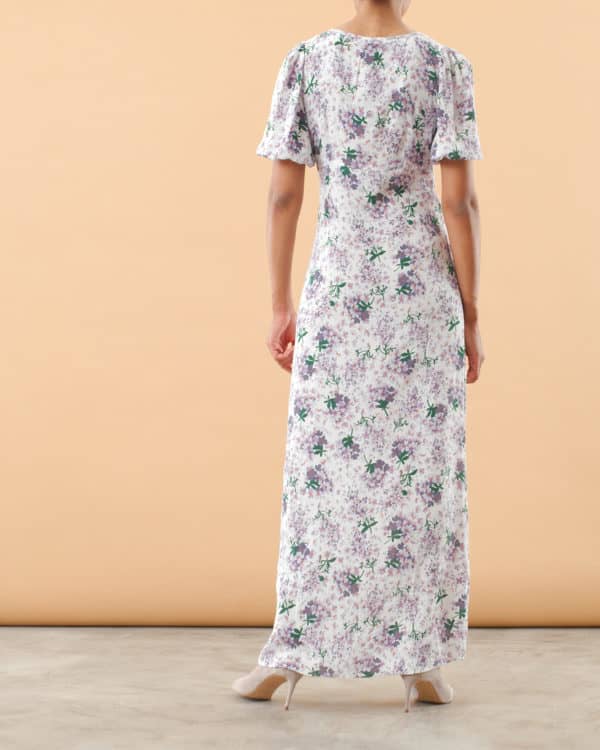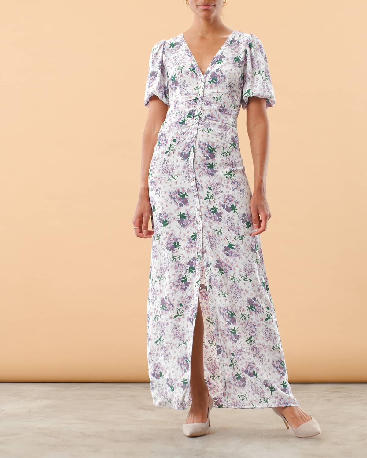 The Summer Maxi Dress is a maxi length, fitted silhouette and short puffed sleeves. The dress has a V-neck, buttons down the front and rouching details in the waist.