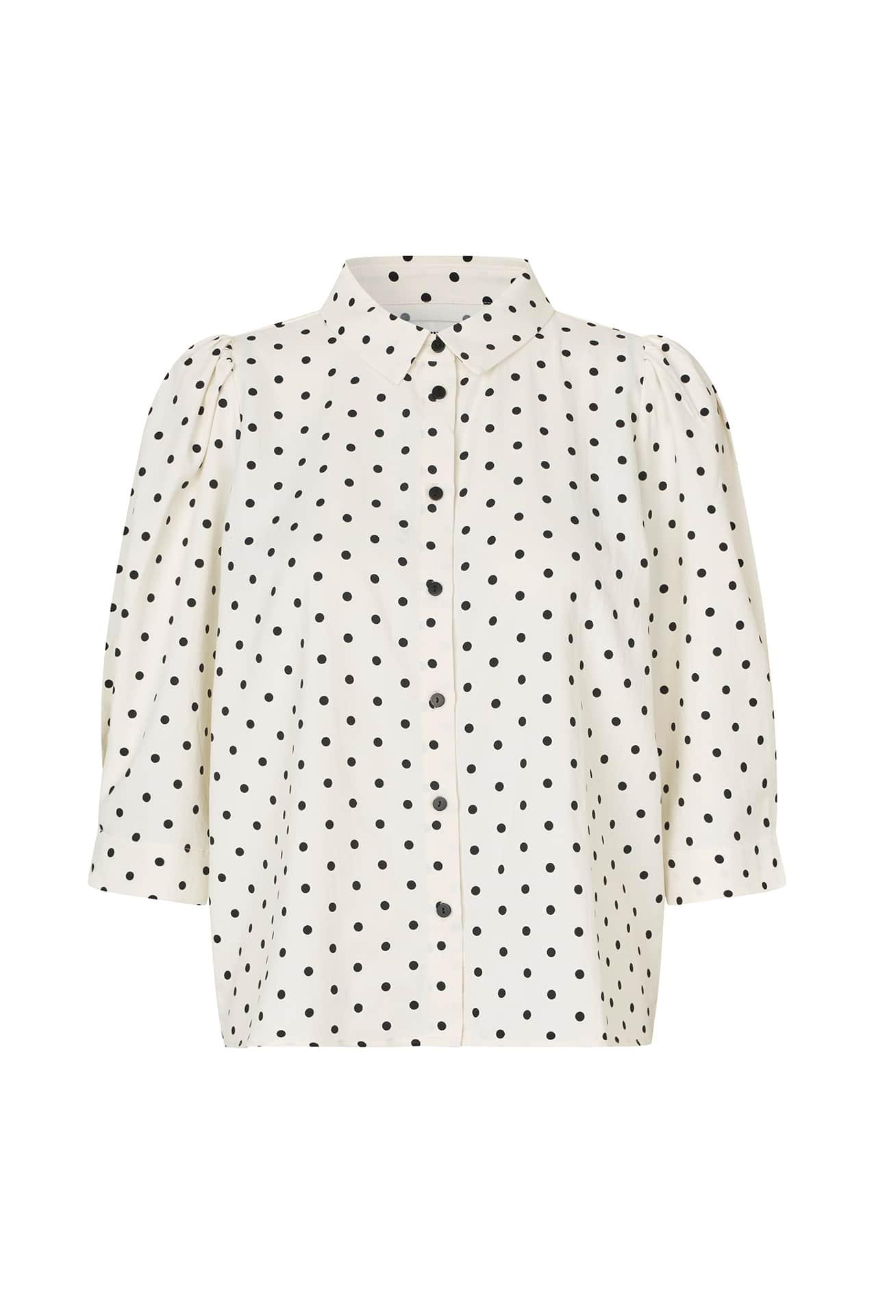 This shirt is a feminine shirt in a beautiful quality that drapes elegantly. The classic polka dot print combined with soft volume creates an effortless look. It features a classic shirt collar, button closure at the front with black buttons, and three quarter sleeves with soft volume creating an elegant and relaxed silhouette.This shirt is easy to style with jeans and skirts.