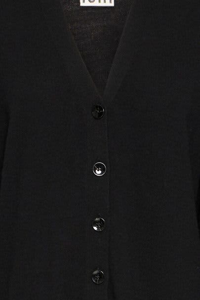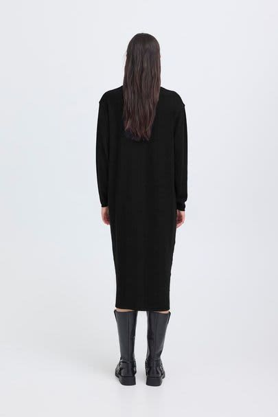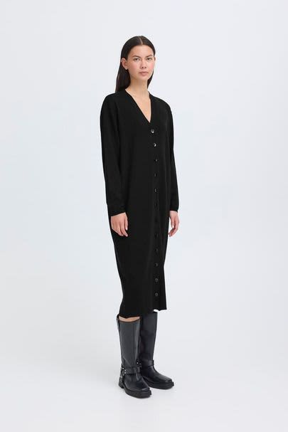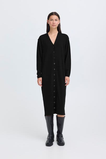 This black cardigan dress is a very practical piece to have in your wardrobe. It is midi length and has a loose stretchy fit. It has a V neck with buttons down the front so could be worn as a cardigan or a dress. Perfect with ankle boots and tights over the Winter.