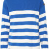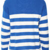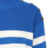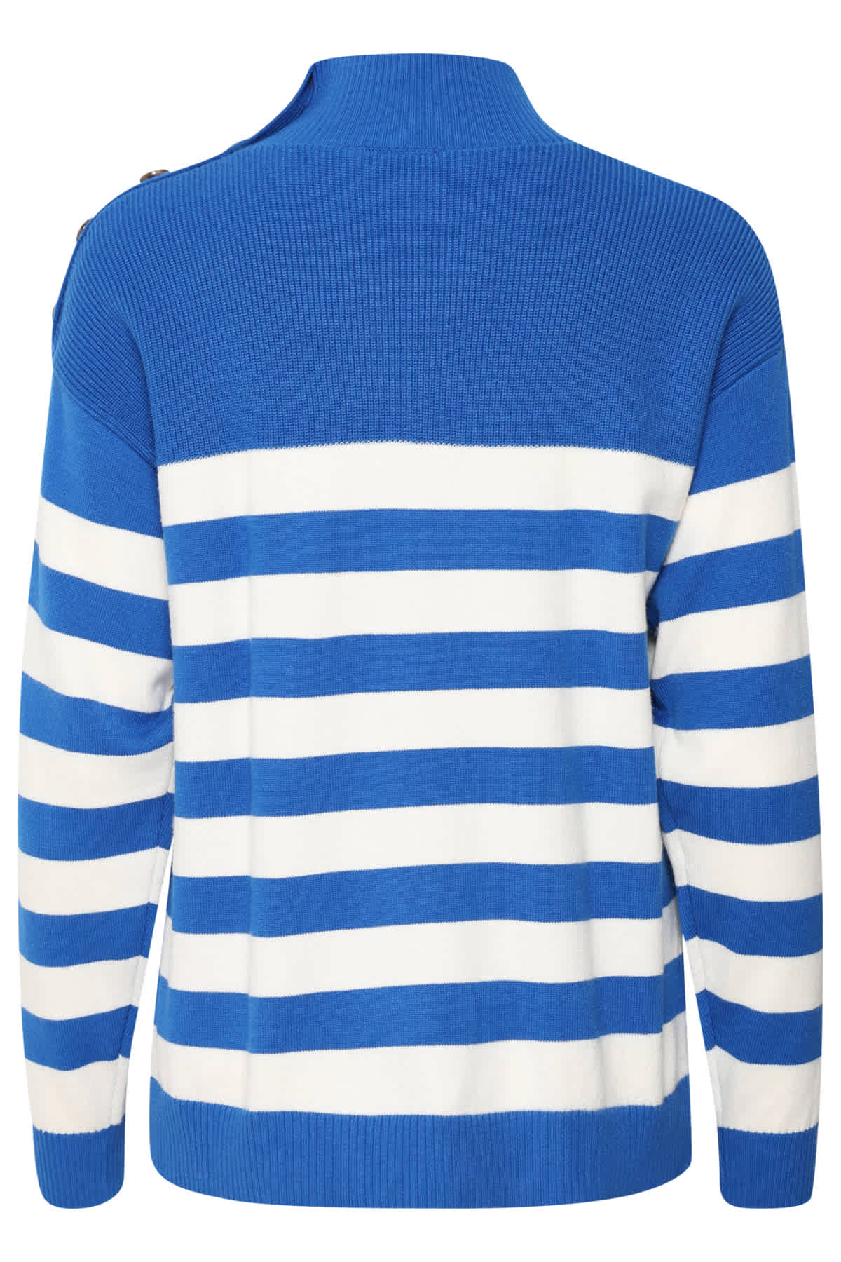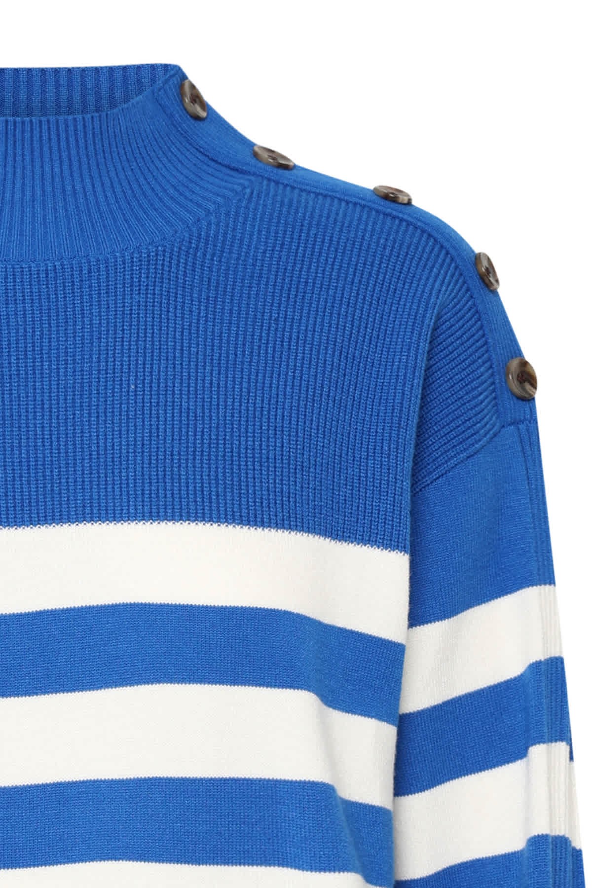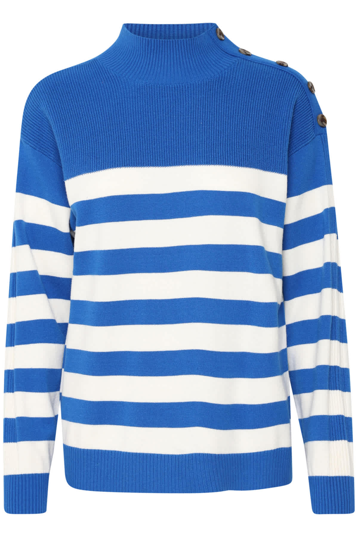 This blue stripe knit is a classic piece to add to your wardrobe. It features a high ribbed neck and a beautiful button detail on the left shoulder. Wear with blue jeans and a tan boot for a smart casual look.