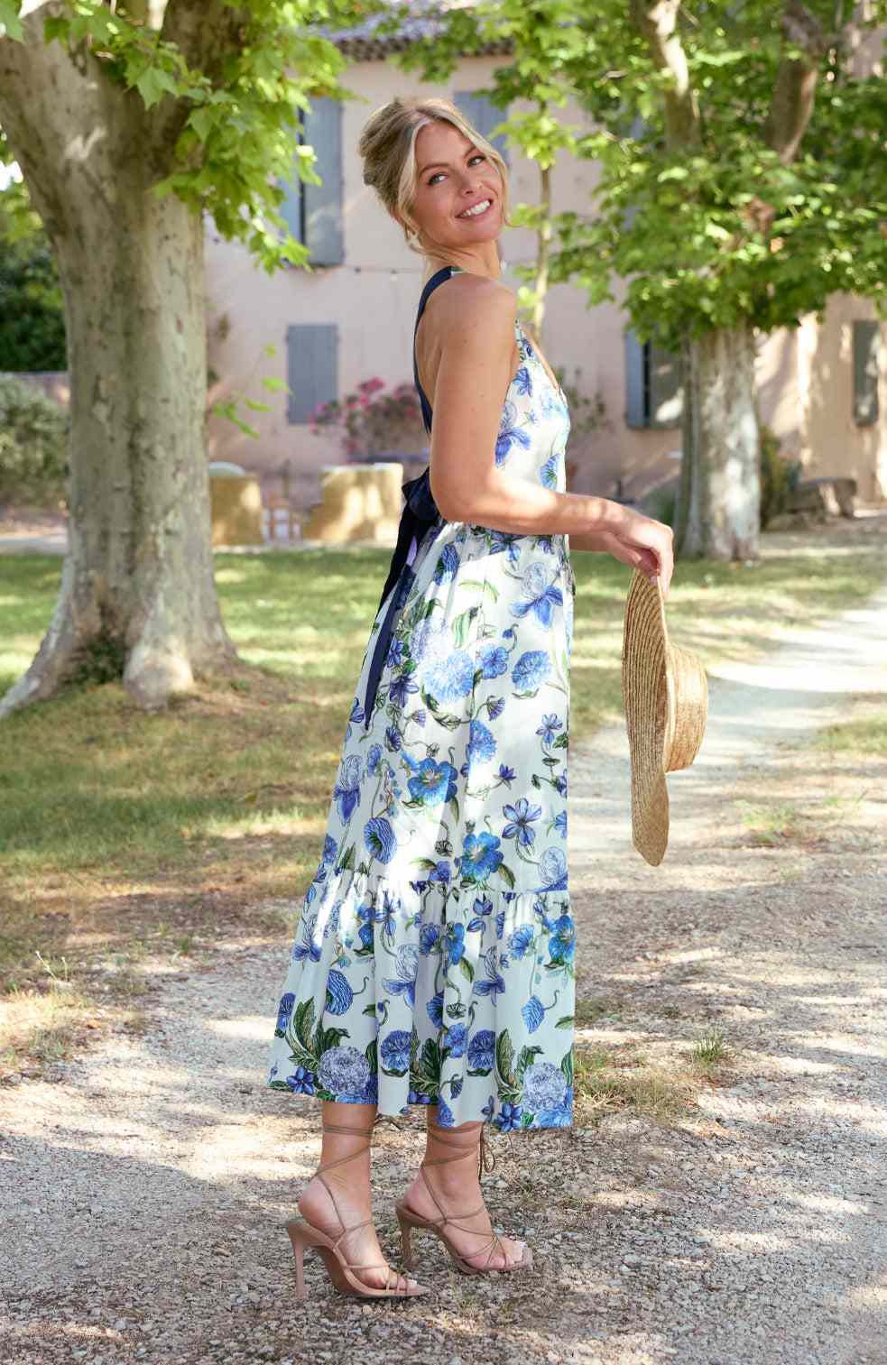 Fresh, refined and subtly romantic, The Bridgette is the perfect early spring event dress. A halterneck cut with cross back detailing creates a sleek silhouette, softened by delicate lace trim. The white and blue palette feels crisp and optimistic for the season, making this a beautiful choice for first celebrations, long lunches and special weekends away.