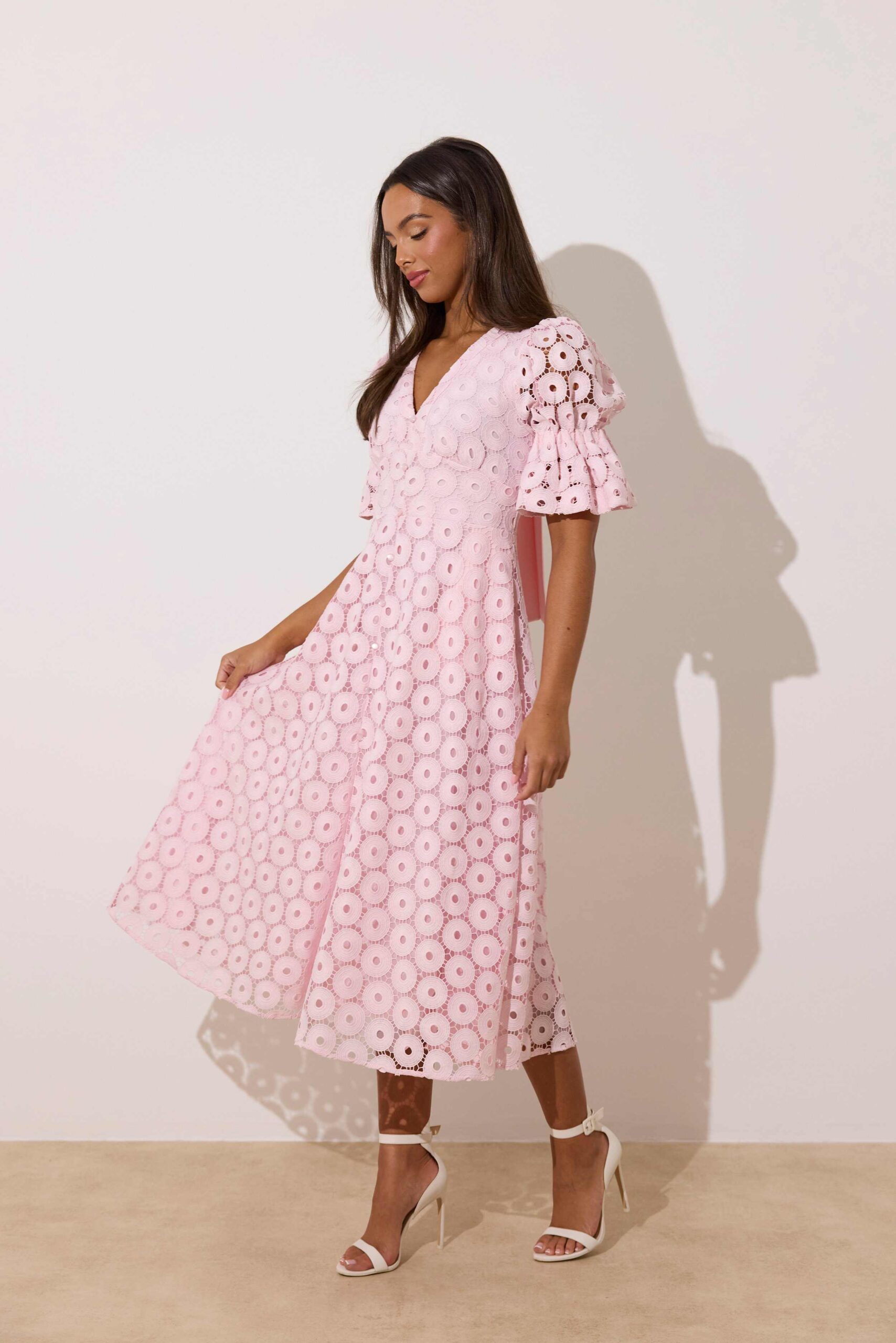 This pink midi crochet lace dress is sure to sell fast. Don’t miss out! It features a beautiful bow back detail to add a touch of extra femininity. The V-neck makes this dress very flattering on the bust whilst complimenting the silhouette. Perfect for ladies day out or a summer occasion such as a wedding or communion/confirmation. The puff sleeves are gorgeous as they really add even more femininity with the frill finish. This dress also has pockets which we all adore. It is fully lined and the skirt is full which we love as it moves beautifully when you walk.