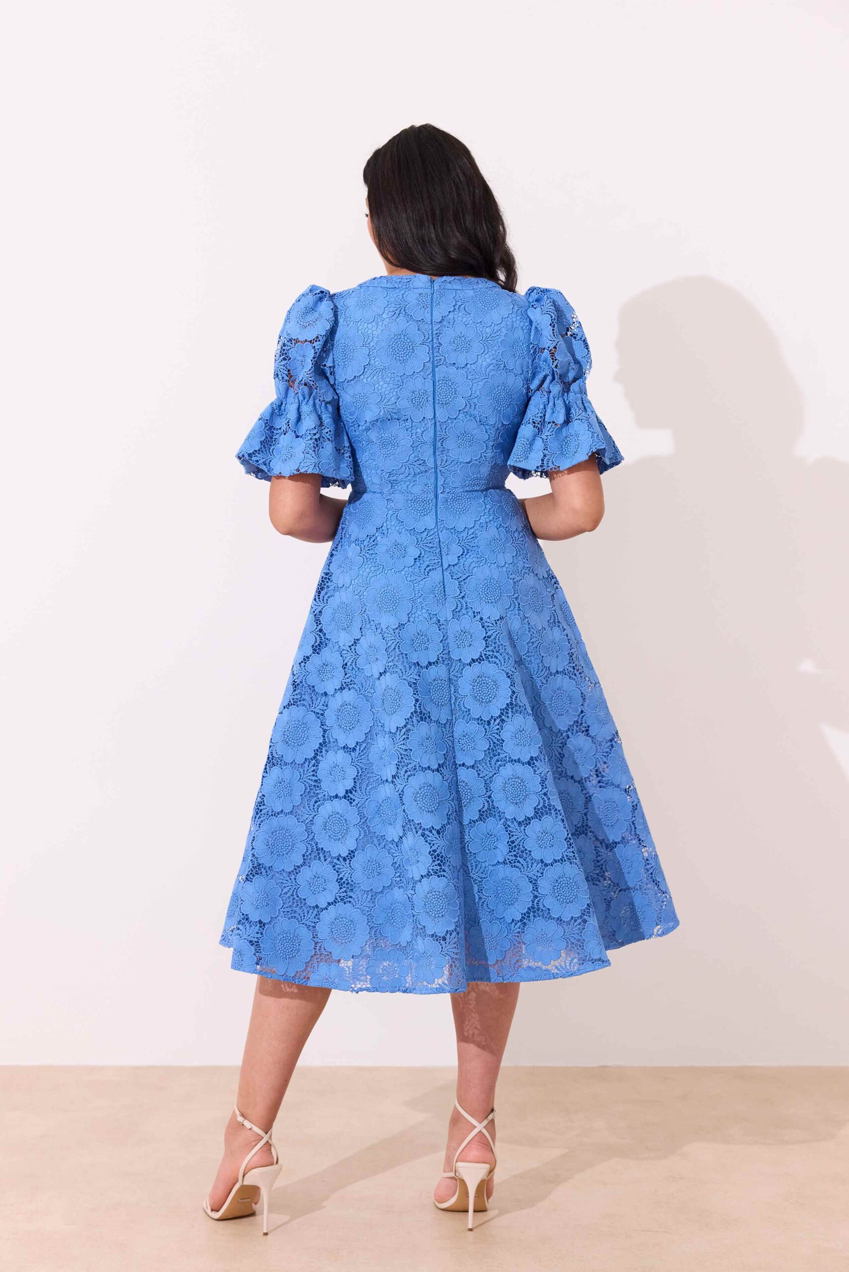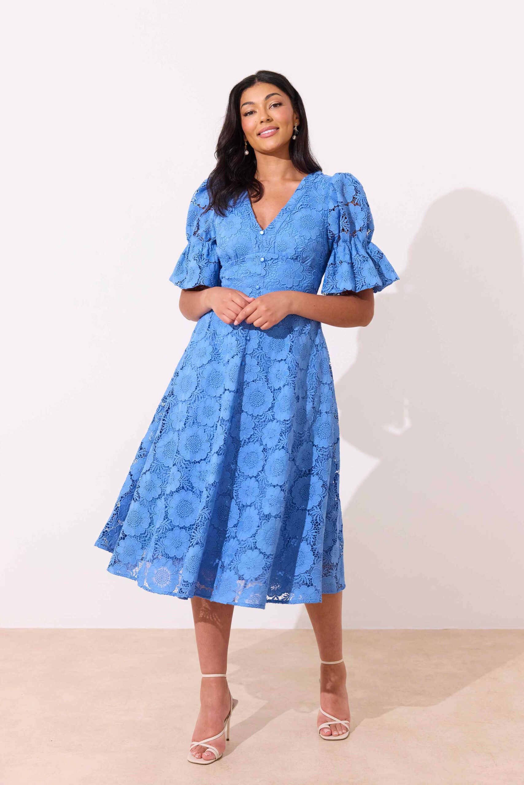 Wow! This cornflower midi crochet lace dress is absolutely stunning. We adore everything about it especially the puff sleeves as you can see the skin through them which is just gorgeous. The V-neck is so flaterring and it cinches in the waist. The colour and fit are ticking all the boxes with this dress. Perfect for a wedding or any occasion. This dress is going to sell so fast! Fully lined. Beautiful button detail down the front.