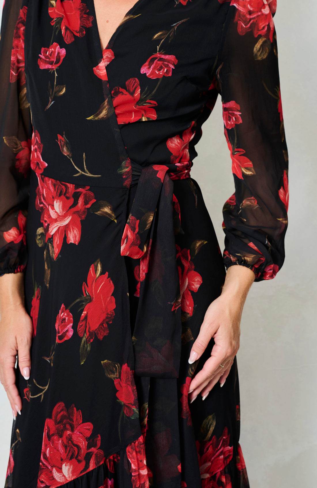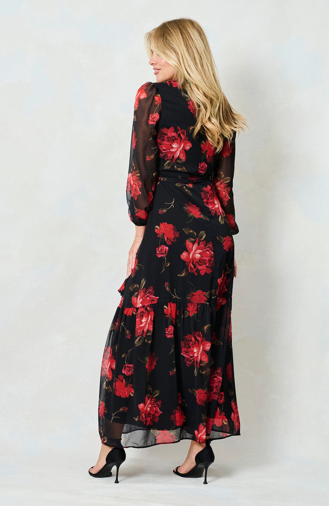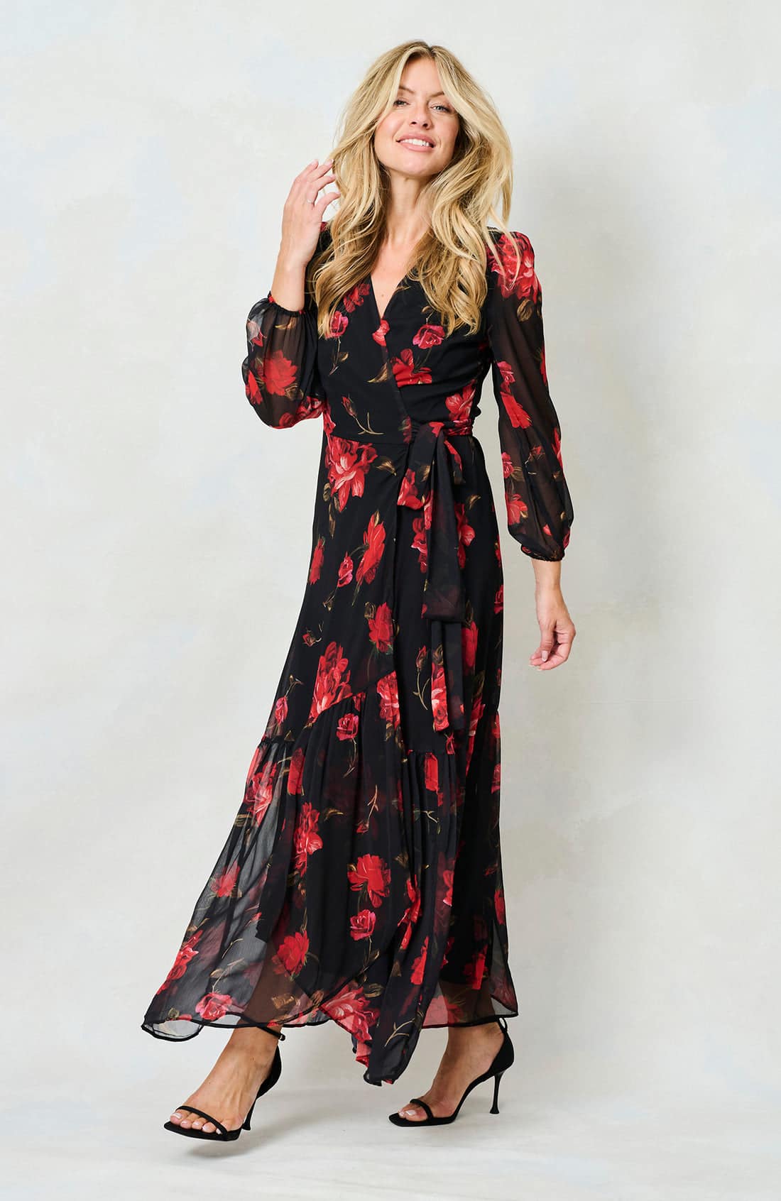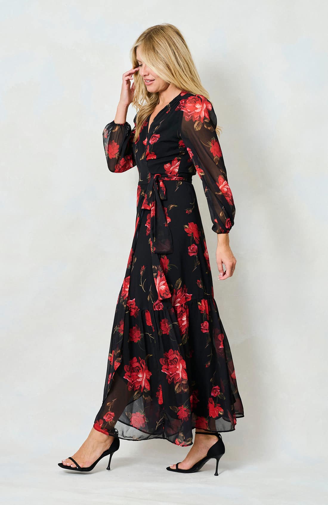 The bright red, hand-stylised blooms decorating a stylish, black chiffon base. Thanks to its flowing maxi skirt and figure-enhancing waist tie, she cuts a beautiful silhouette, with full length blouson sleeves offering endless style to this modest occasion dress. Whether you’re headed out for an evening event or need a dress for a winter wedding, The Camilla is a beautiful choice.