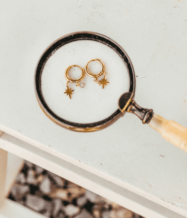Mini hoop earrings in plain steel or gilded with fine gold on which are suspended a Northen Star motif and a zirconium in a closed setting.