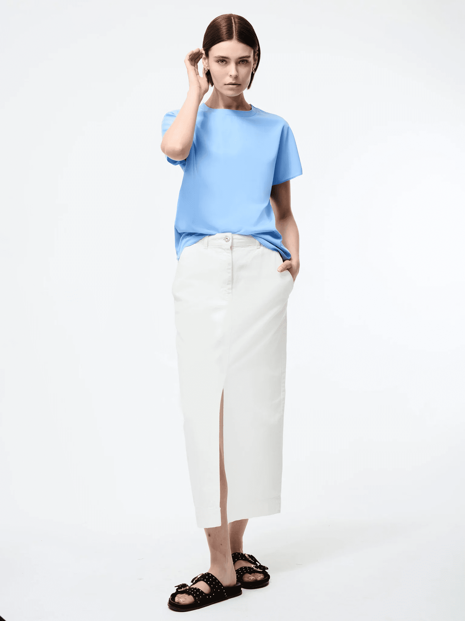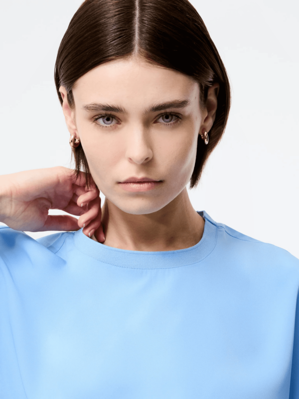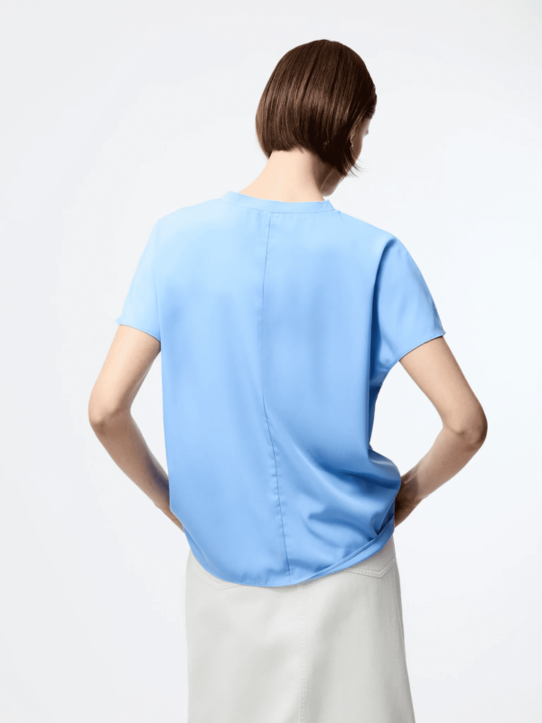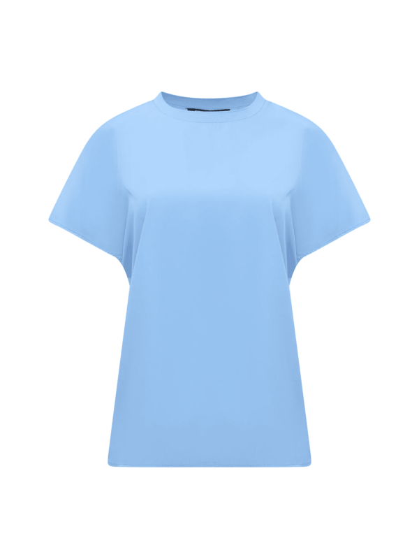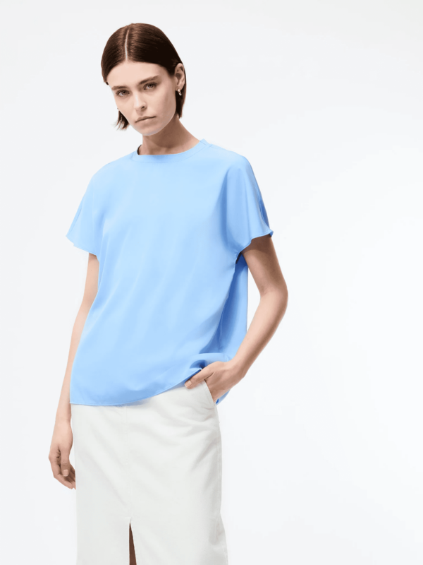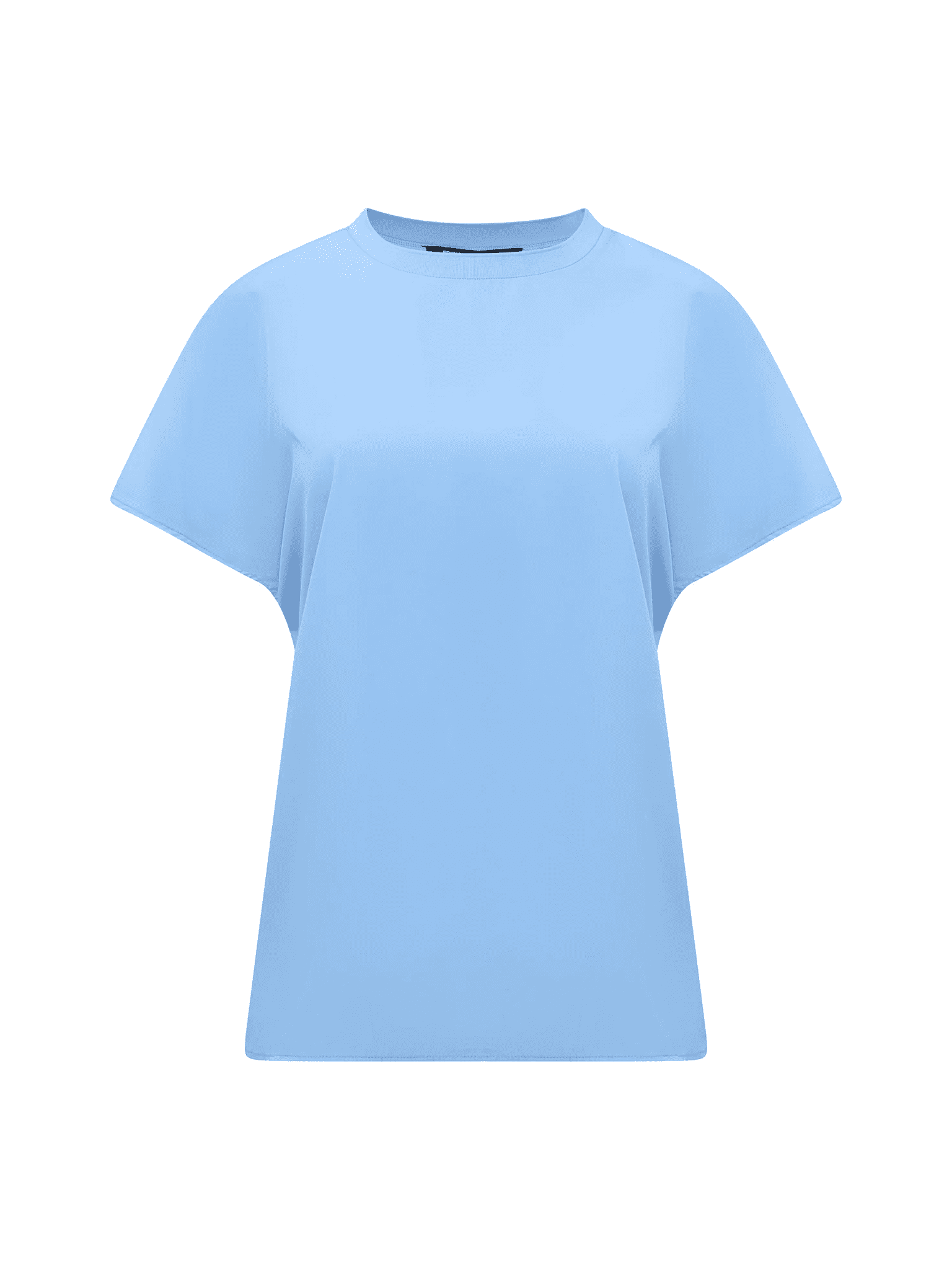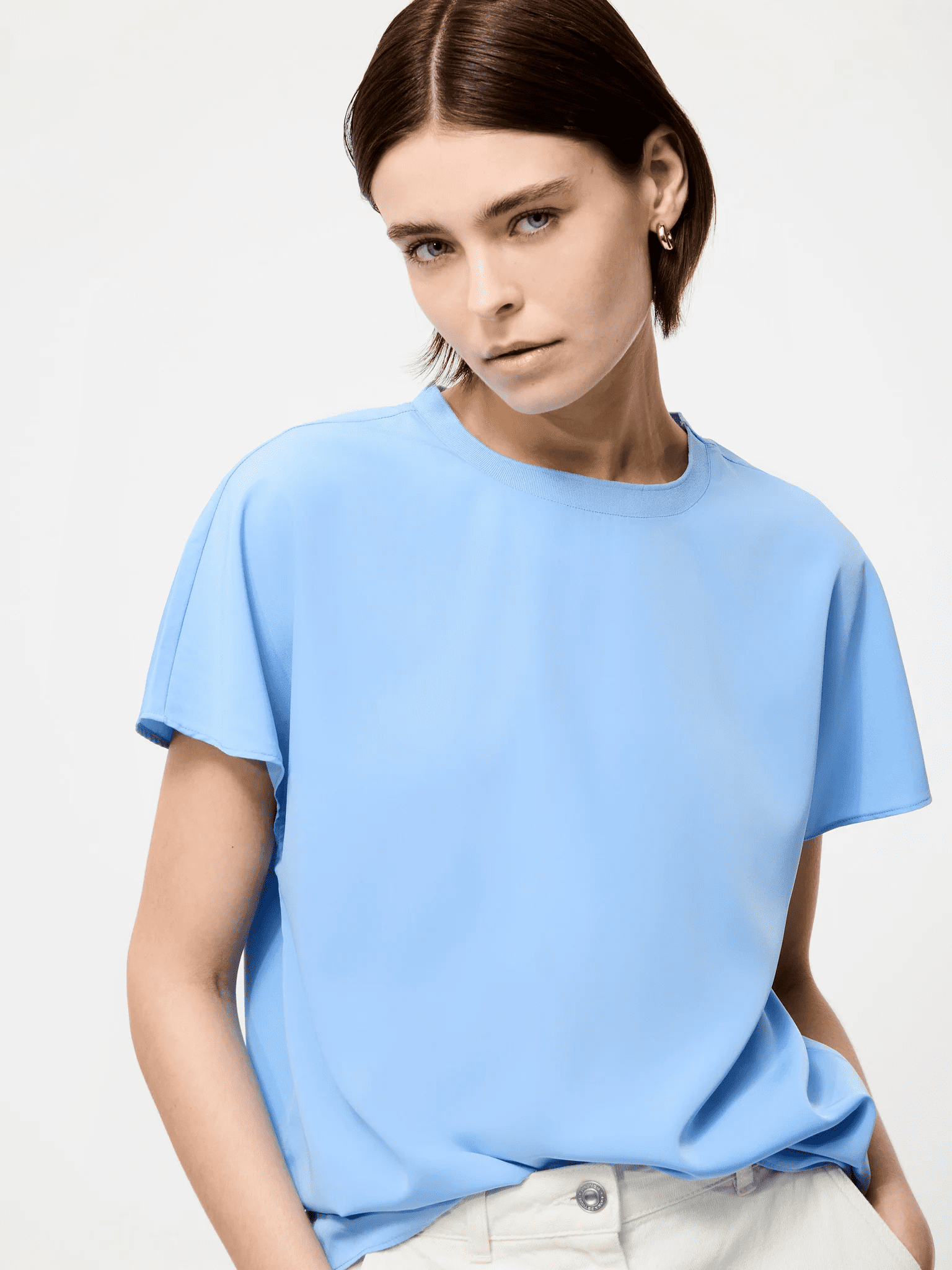 Your wardrobe will be floating on air with the addition of this Crepe Light Crew Neck Top. This easy and breezy top stars in a cornflower blue shade and offers a light layer with cap sleeves and a crew neckline to be worn from day to evening.