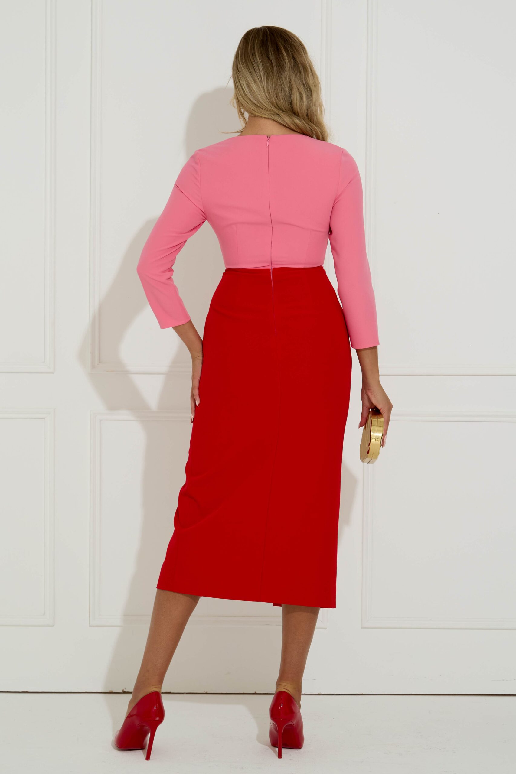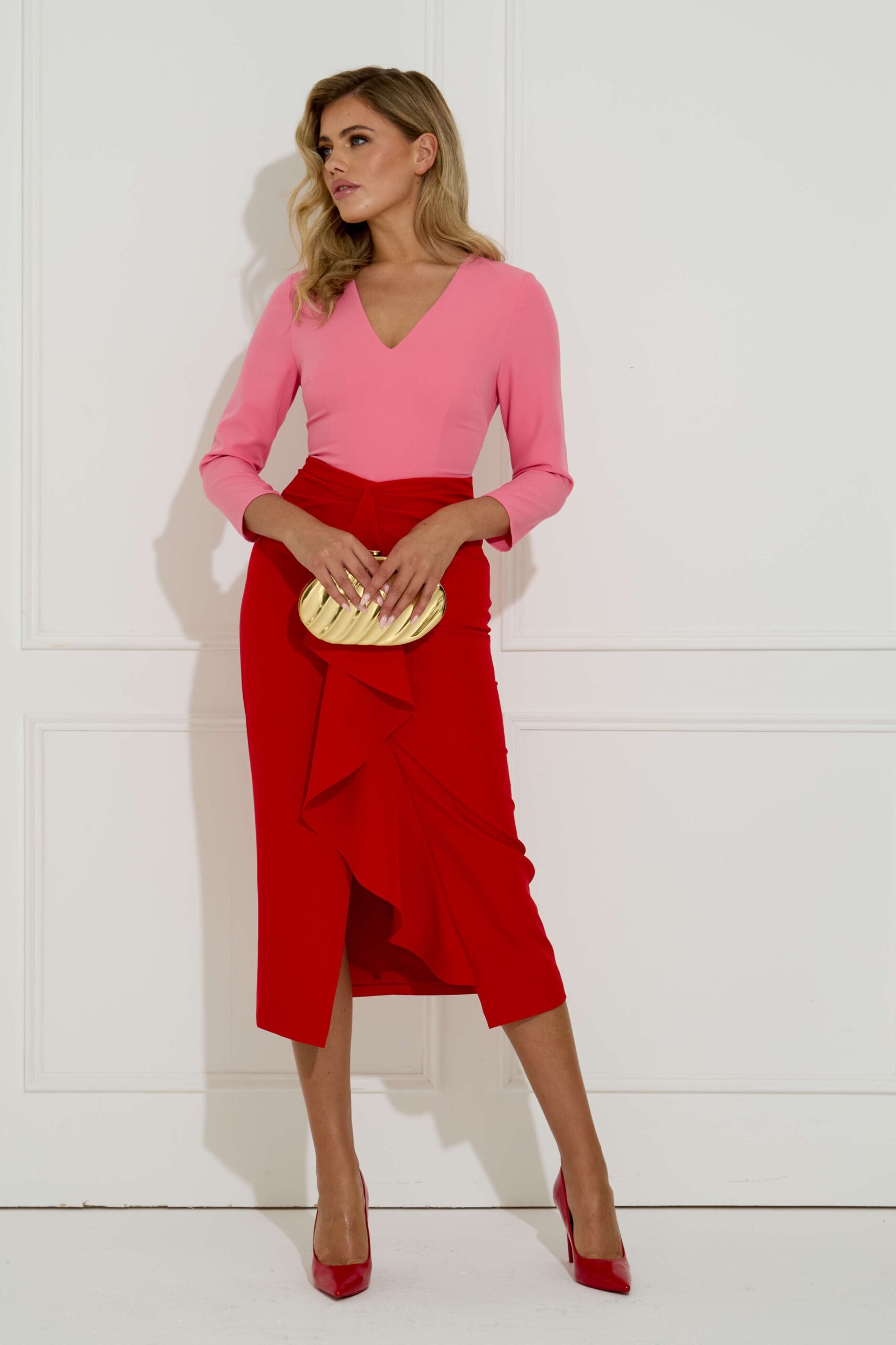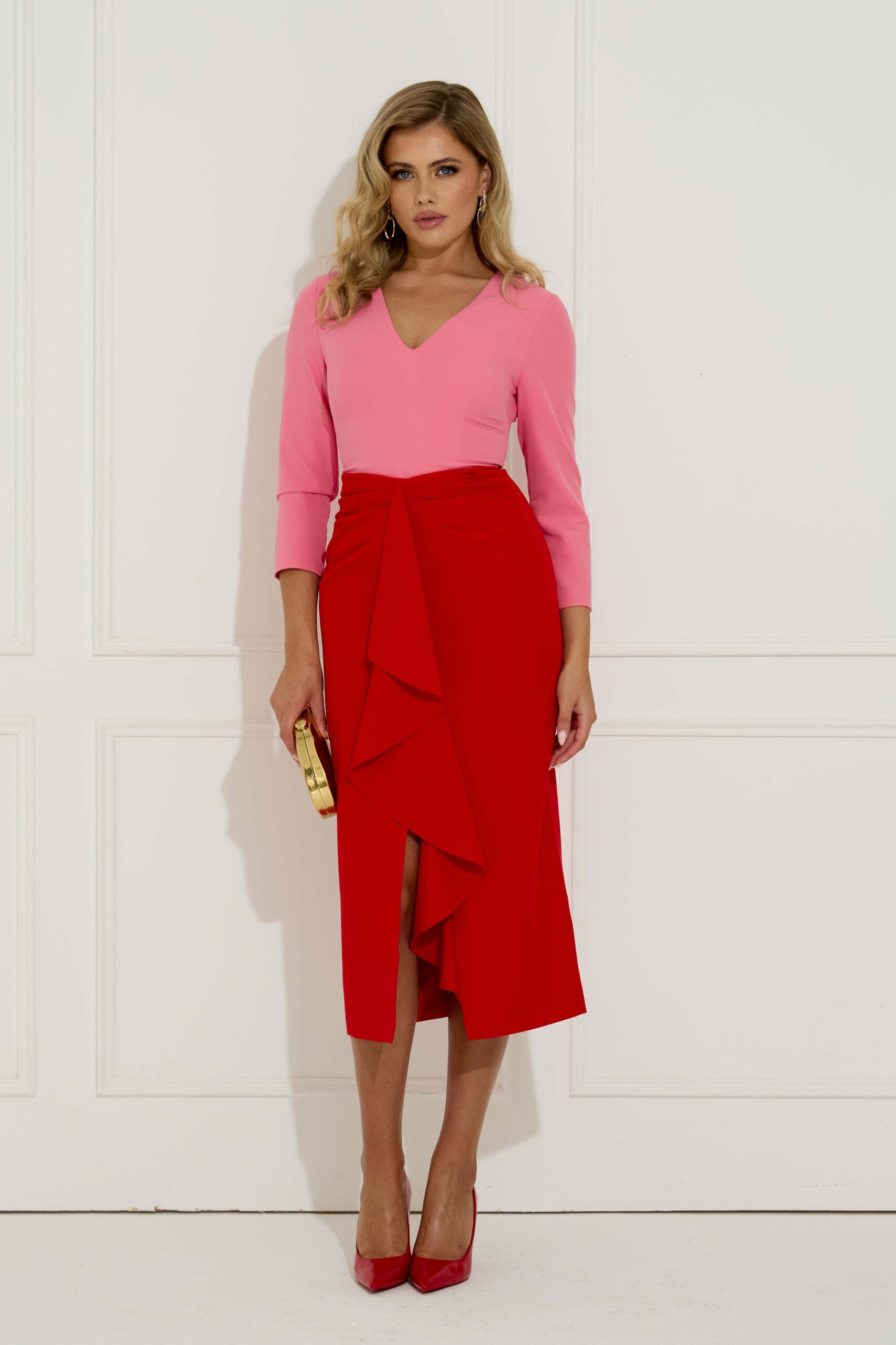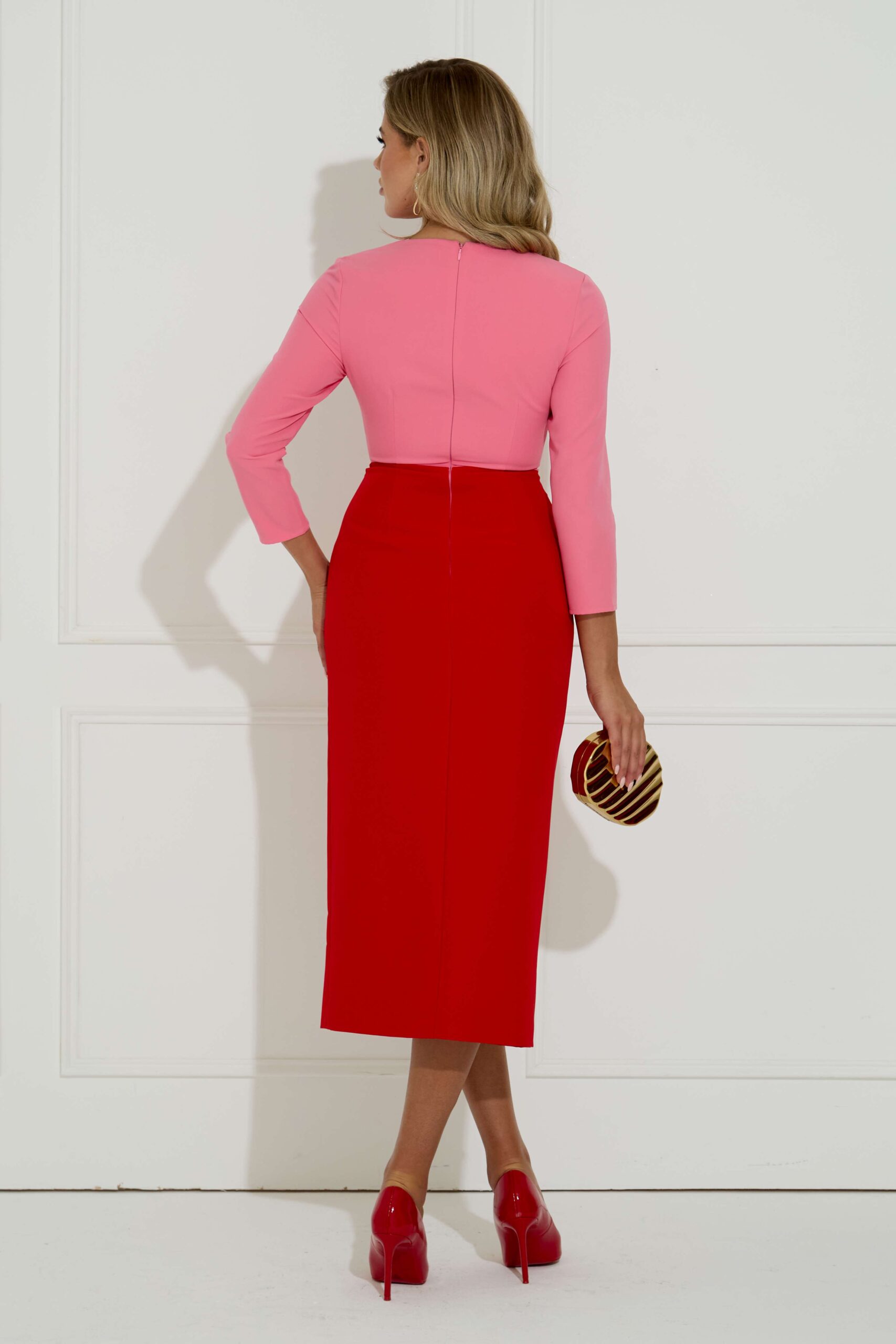 We adore the colour combination of red and pink in this dress. The block colours are always such a timeless way of styling your outfit and getting the best of both. The V-neck and midi length compliment the 3/4 length sleeve and ruffle detail on the front concealing the tummy drawing you in at the waist. Fun and flattering, you will be sure to turn heads in this. Fully lined. Zip at back.