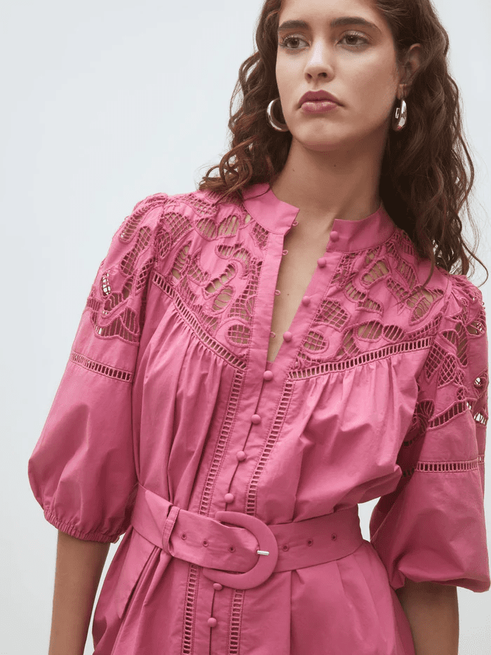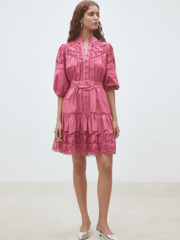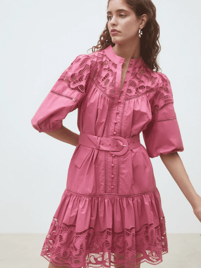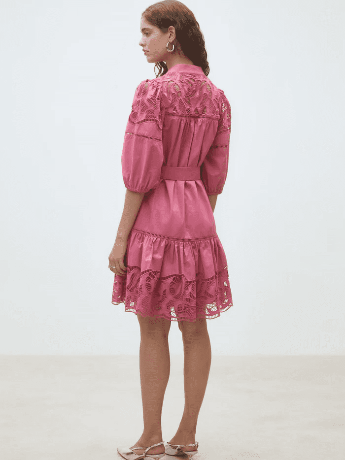 We are in love with this beautiful pink mini dress. It features half length sleeves with elasticated cuffs and a button down front. It has a high neck and is belted to cinch you in at the waist. The lace detail makes this dress such a pretty piece to have in your Spring/Summer wardrobe. Wear with heels or flats to dress up or down. Perfect for the holidays! Fully lined from the chest down.