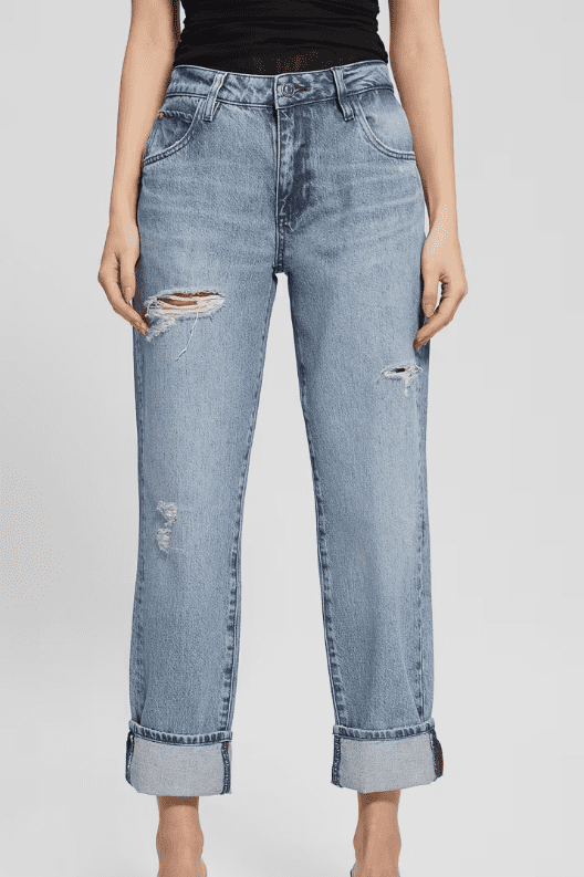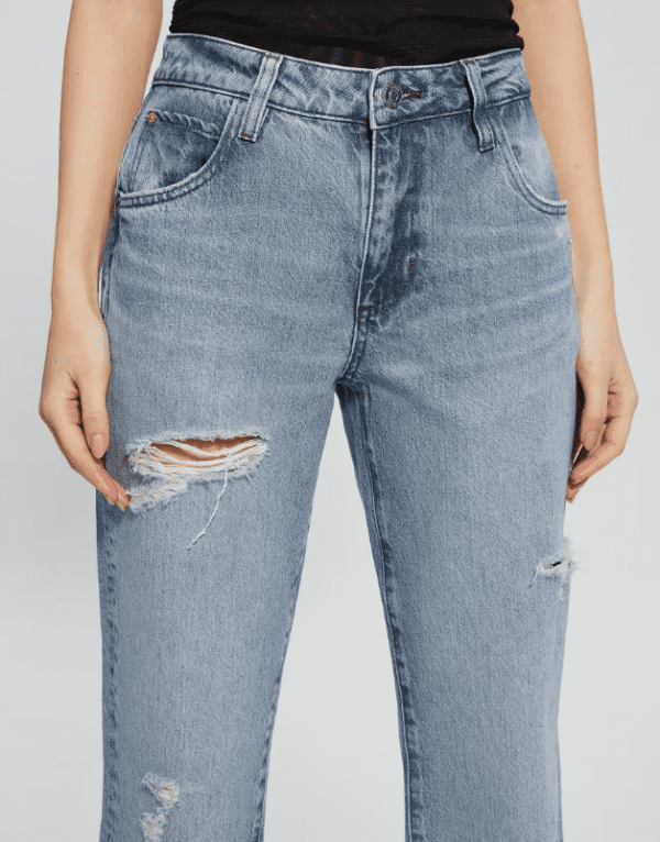 These light blue jeans feature a classic regular fit with a comfortable mid-rise waist and a regular leg length.. They are a five pocket jean in a Lyocell blend denim. They also feature a cuffed hem, a rip detail in each leg and have a button fastening.