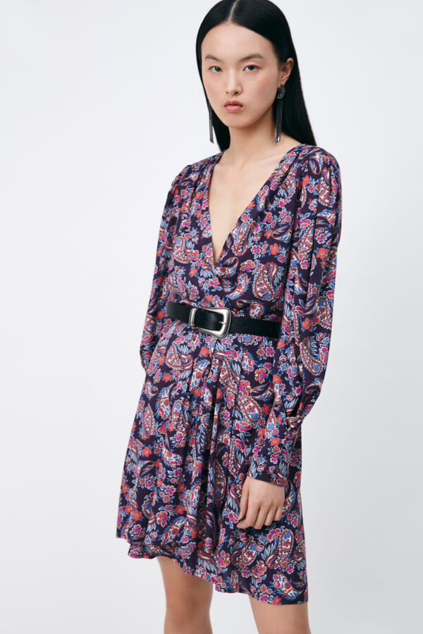 This soft wrap style mini dress has a nipped in waist and side zip. The dress has a v-neck, long sleeves that finish with a buttoned cuff and it has an elasticated waist band at the back. Note. Belt pictured is not included. this is stylists own.