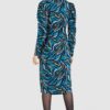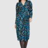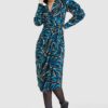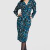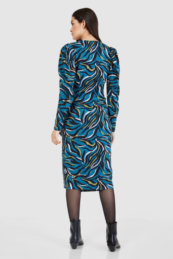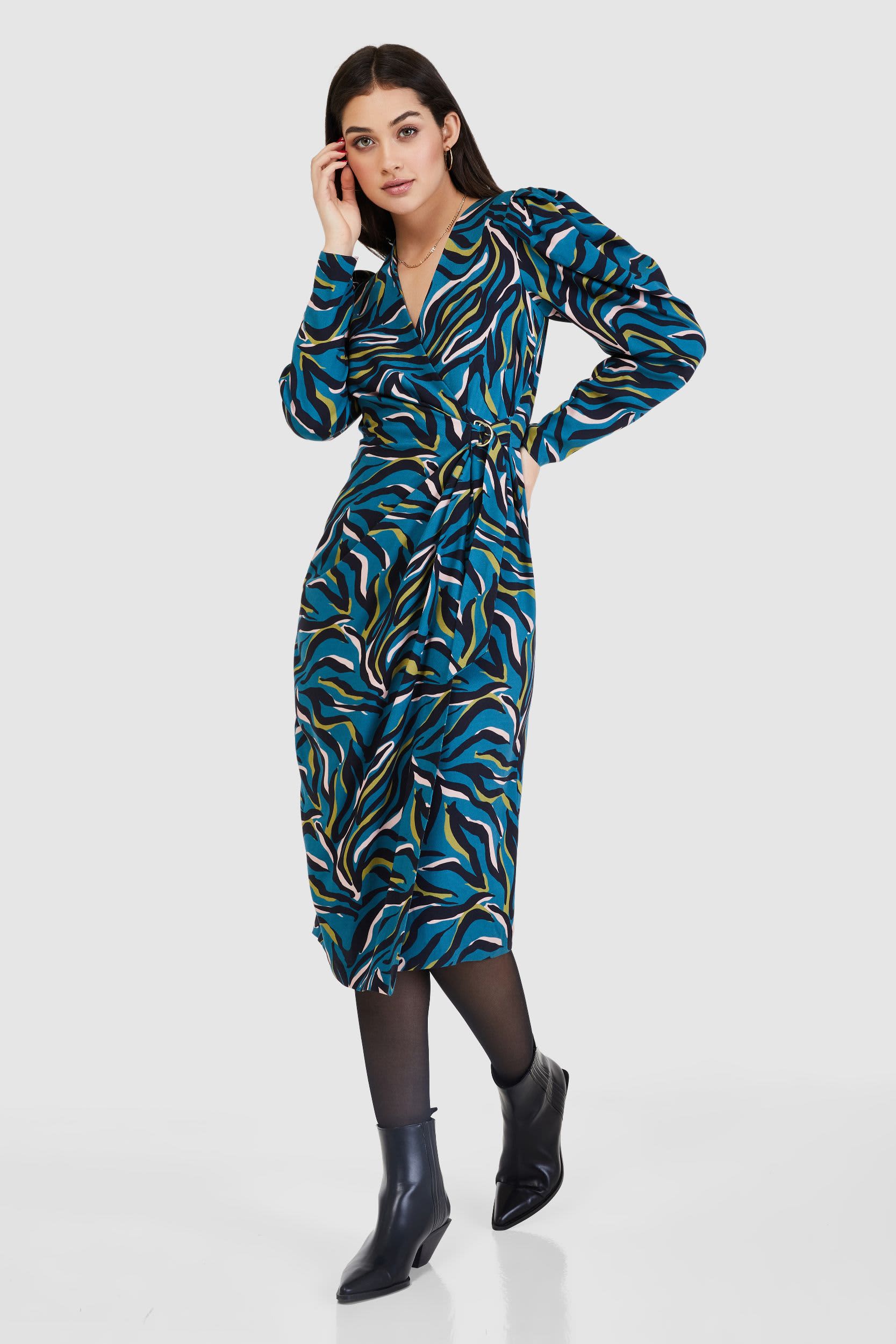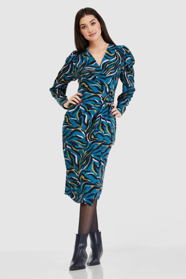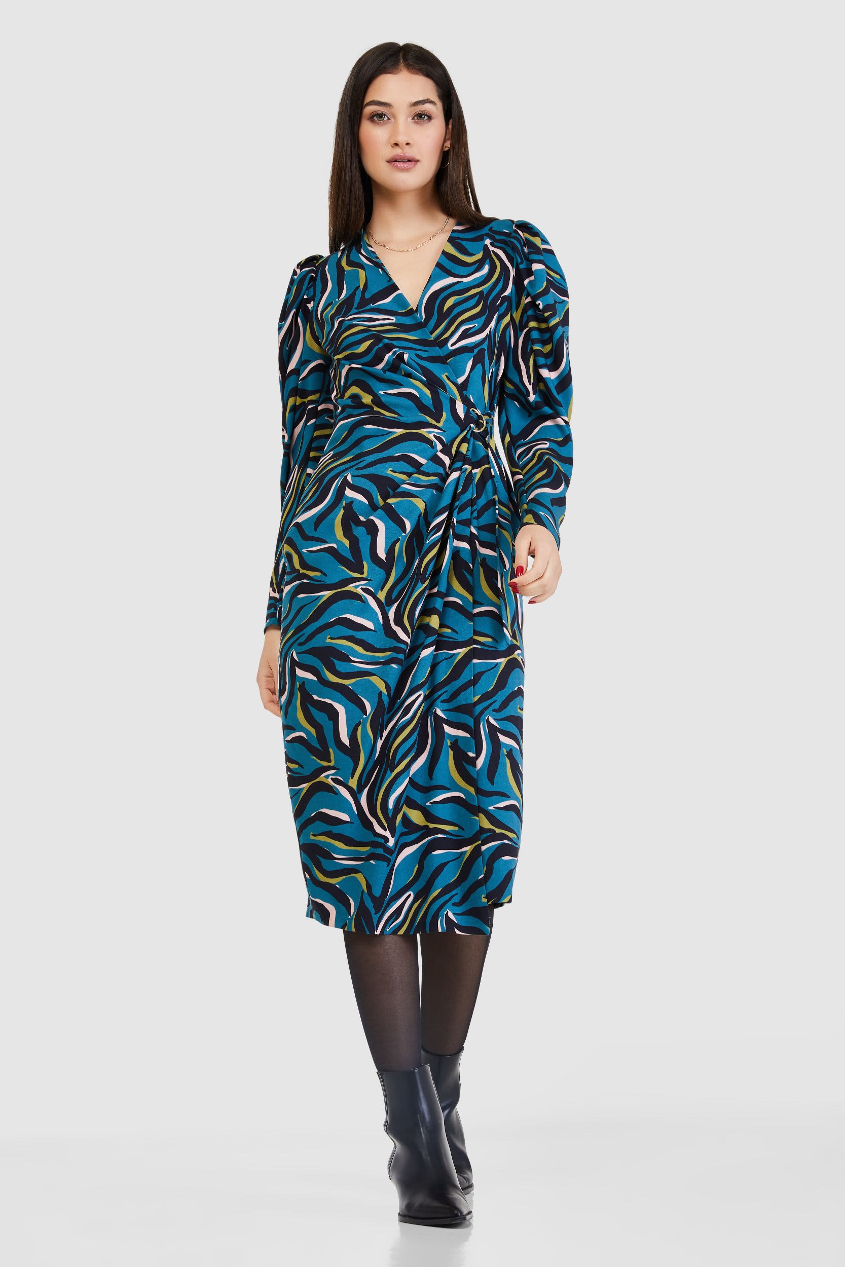 A figure enhancing draped wrap style dress with pleated sleeves, that fastens with a d-ring. In a fabulously coloured tiger like print.