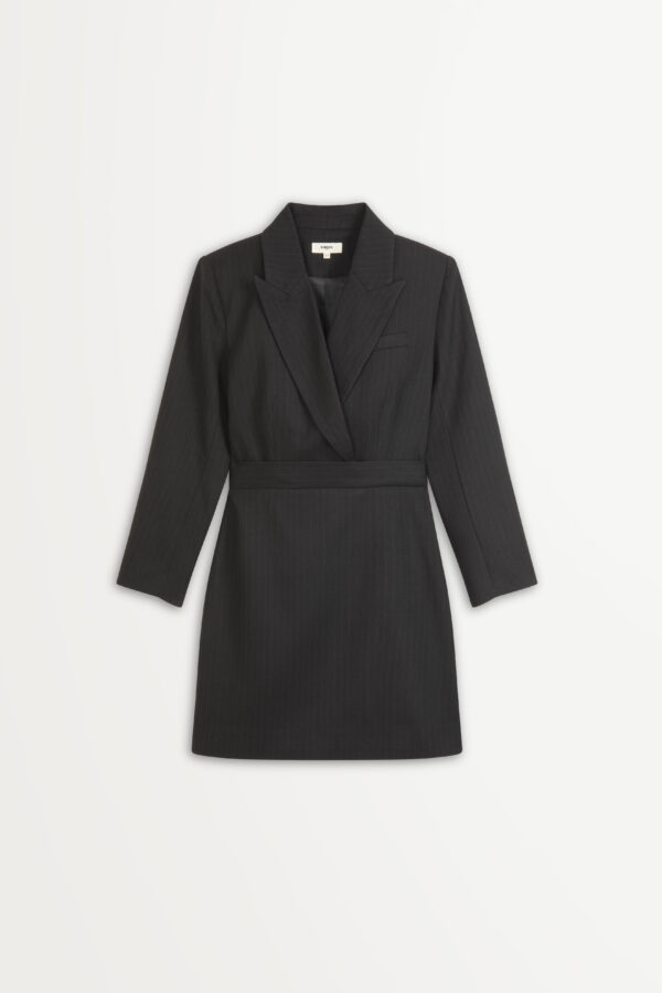 A classic blazer style dress with wrap over front, nipped in at the waist. Sublte blue pinstripe throughout. Perfect dress to take you from day to night this winter.