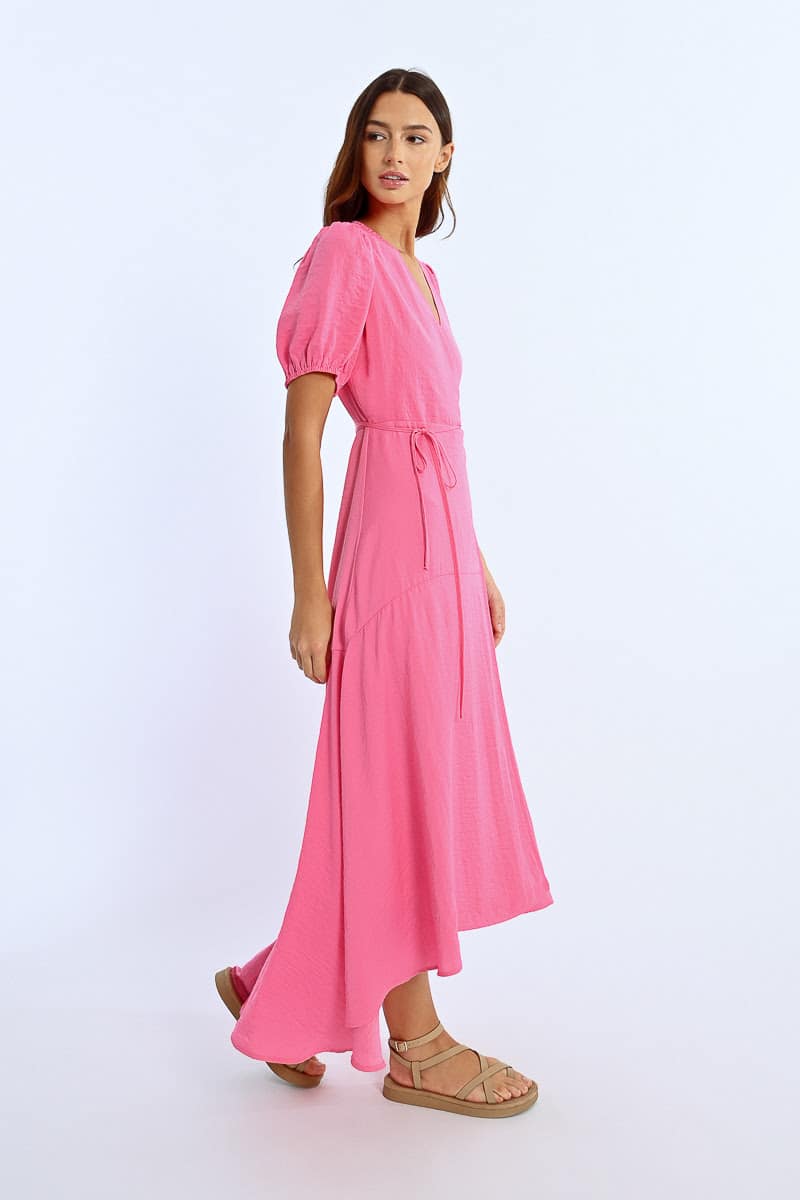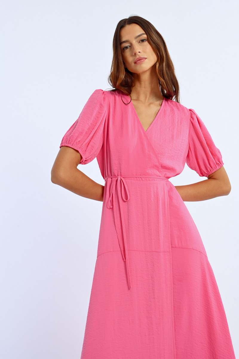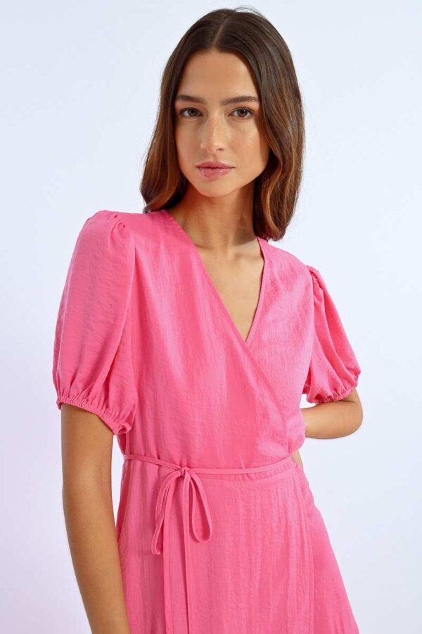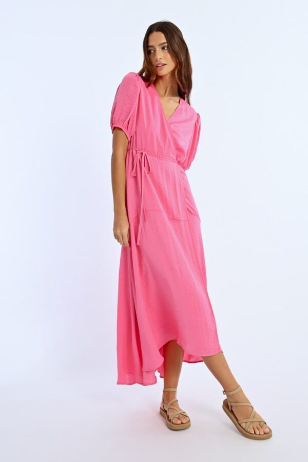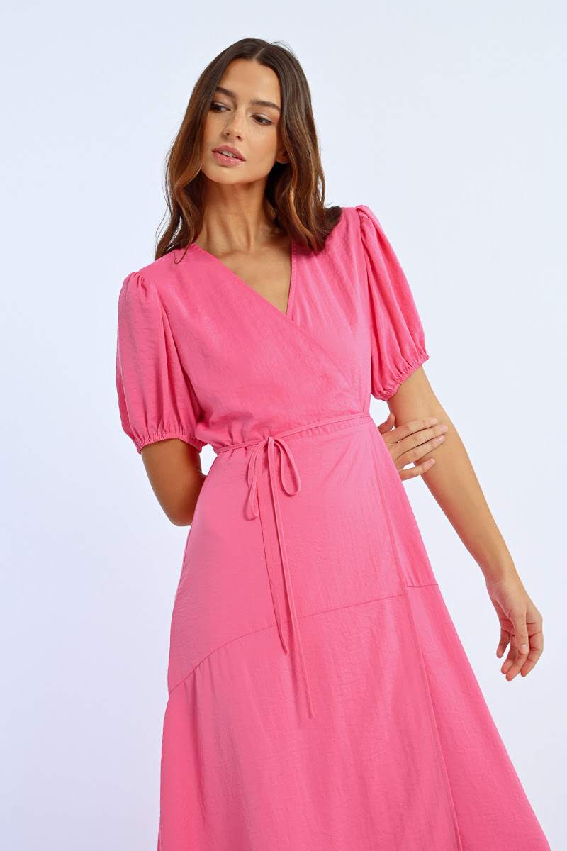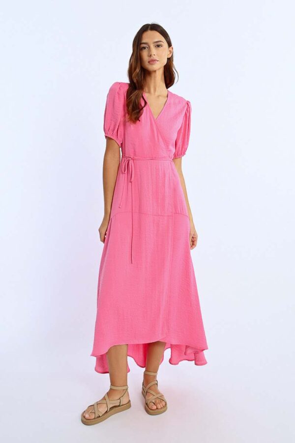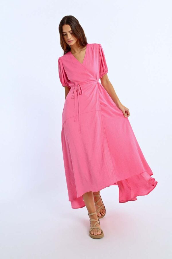 This light pink wrap dress is perfect for any occasion this Spring/Summer. We adore the simplicity of it as it would be ideal for holidays with a flat sandal or dress it up for an occasion such as a communion with a strappy sandal. This dress is midi length with a dip hem and has a short sleeve that features an elasticated cuff for comfort. Fully lined.