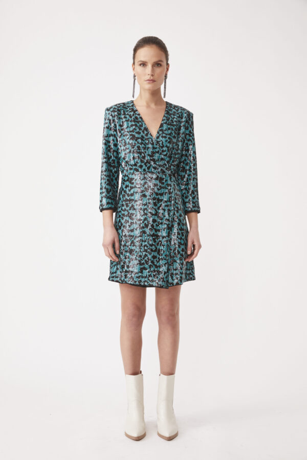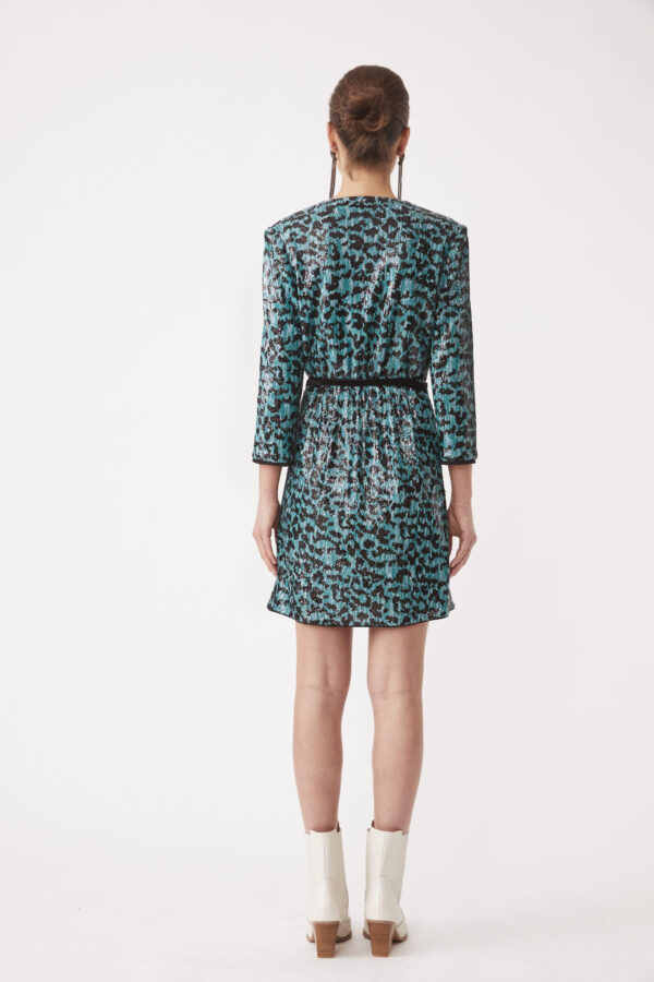 Fabulous wrap, knee length, dress with leopard print turquoise and black sequins. The sleeves are three quarter length and the dress ties with a black velvet tie. The dress is fully lined.