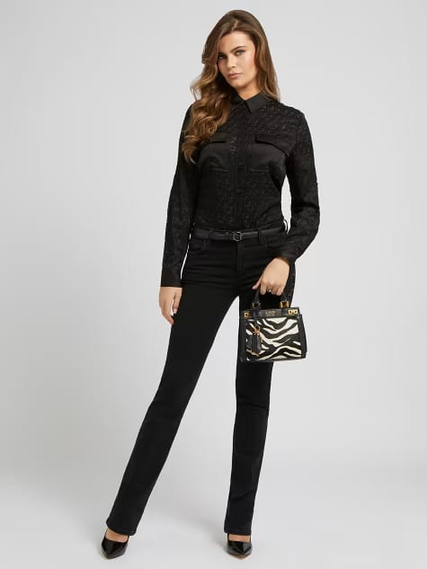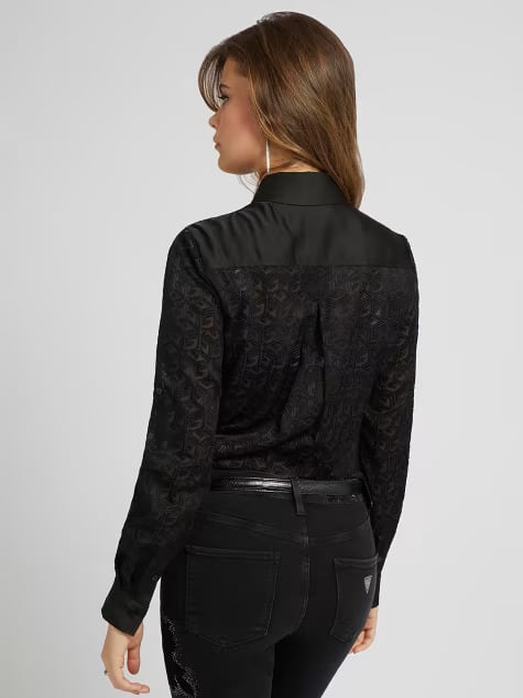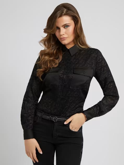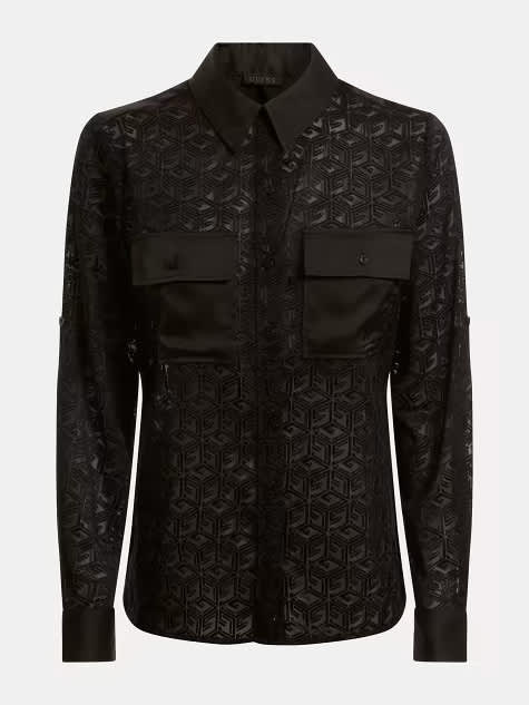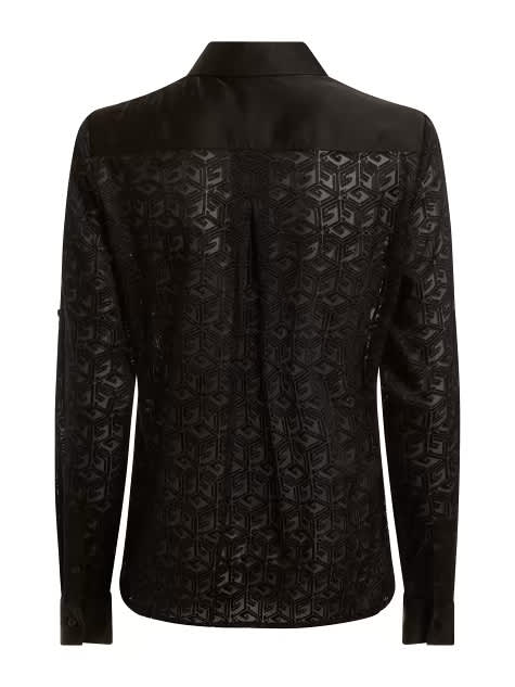 Black translucent blouse with GUESS print. It is a blouse with long sleeves and a shirt collar. It’s is closed with a series of buttons. Pocket and shoulder details. A great day to night piece for your wardrobe.