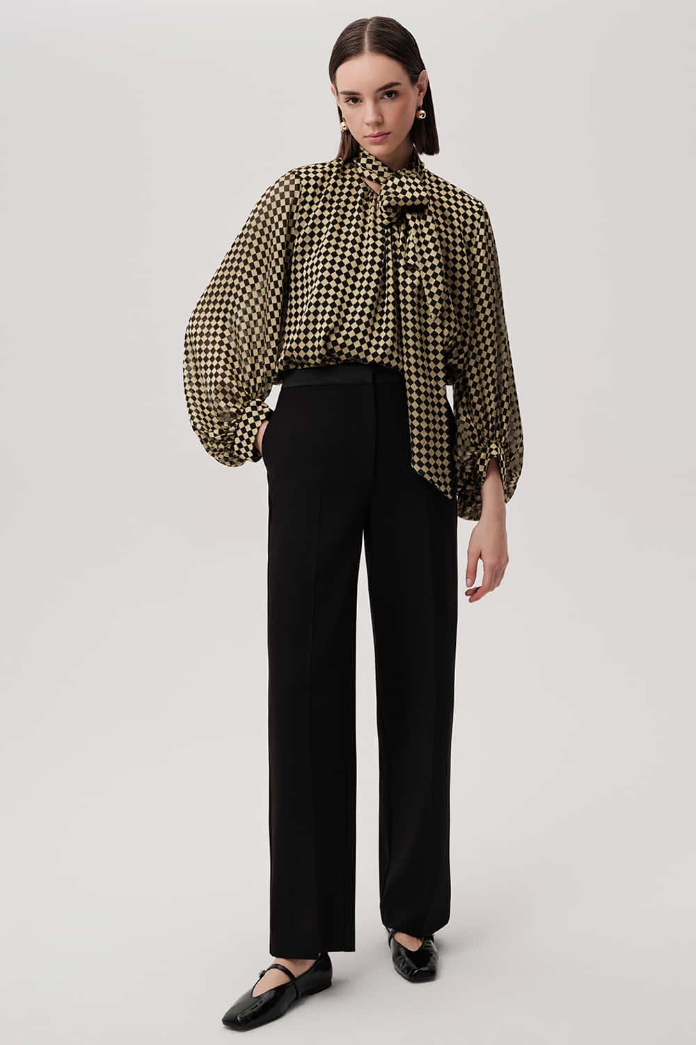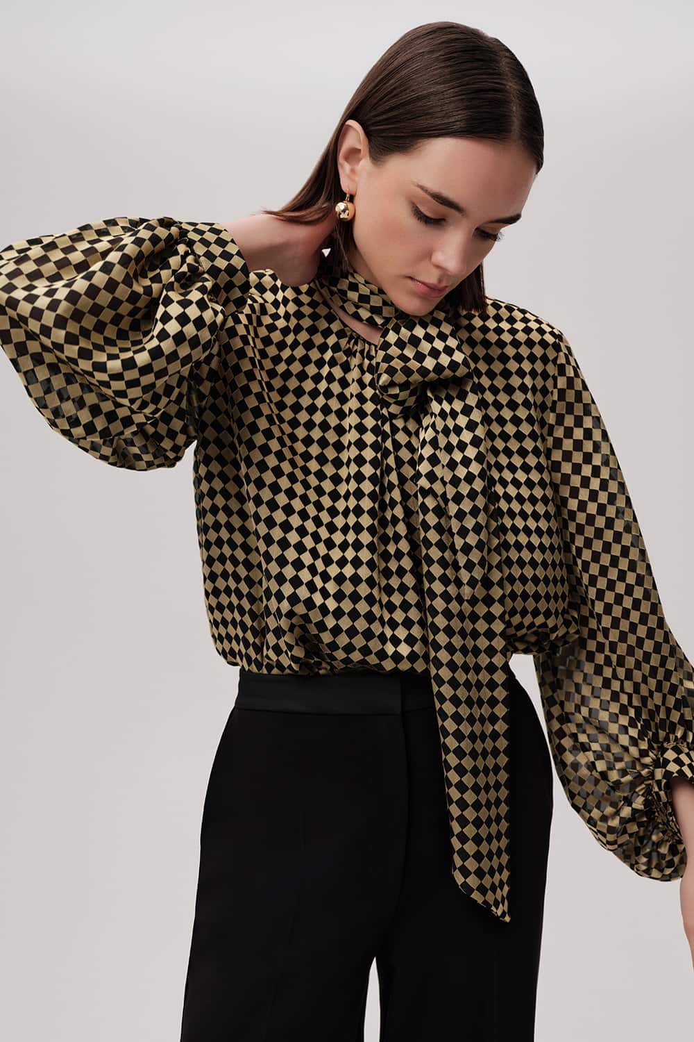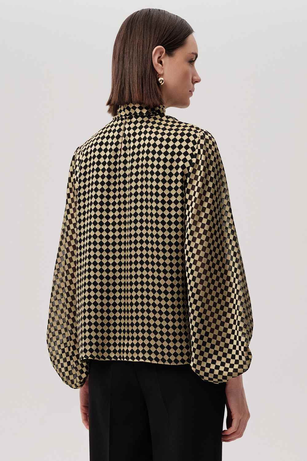 This striking gold and black diamond patterned blouse has long lantern shaped sleeves, a round neck and removable tie collar. The body of the blouse is fully lined.