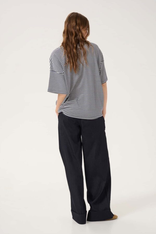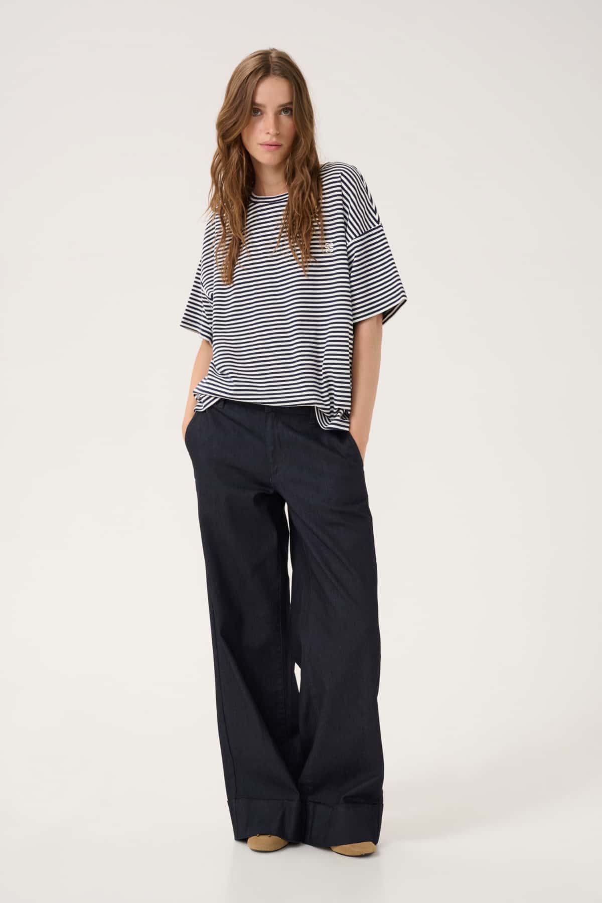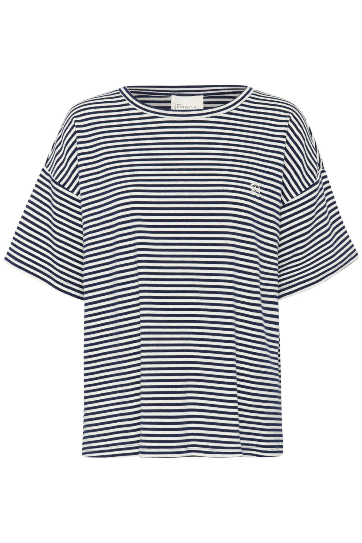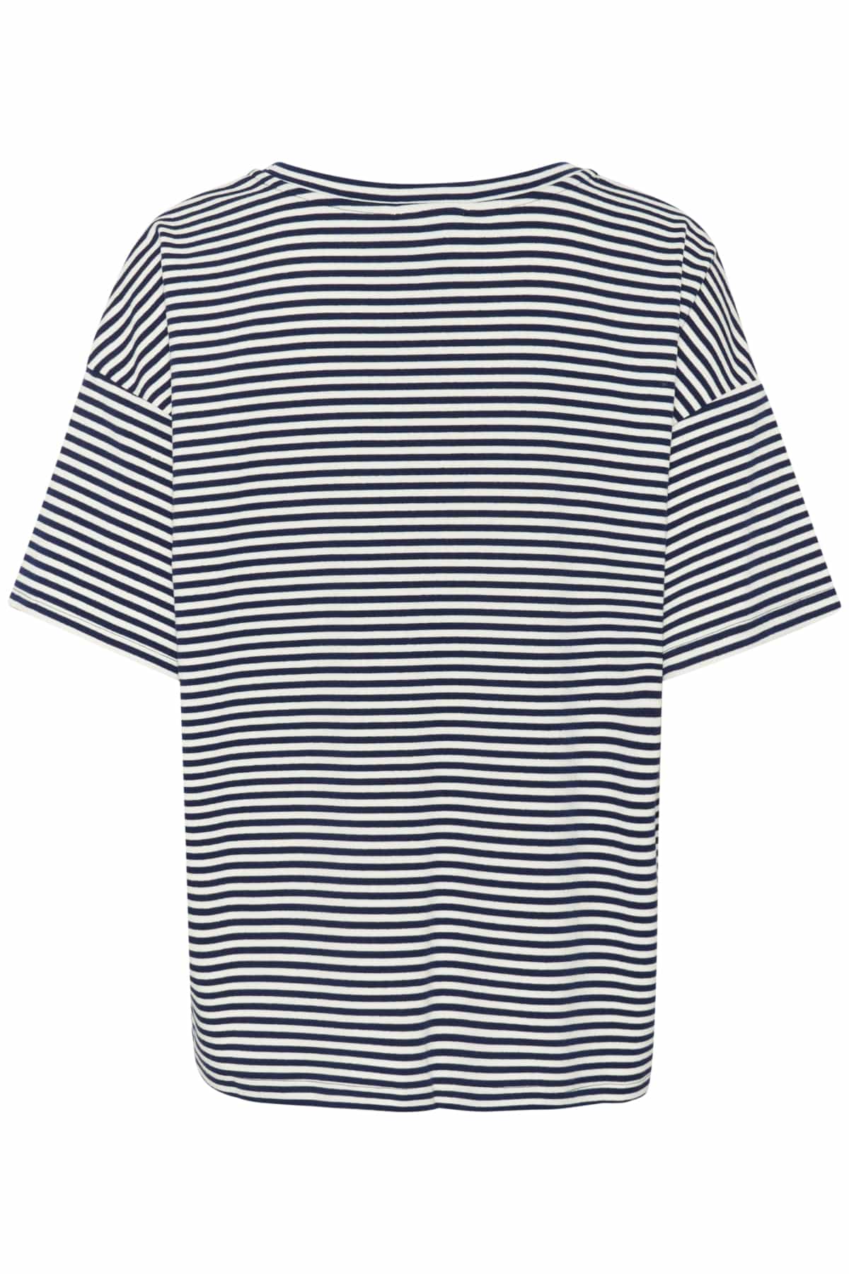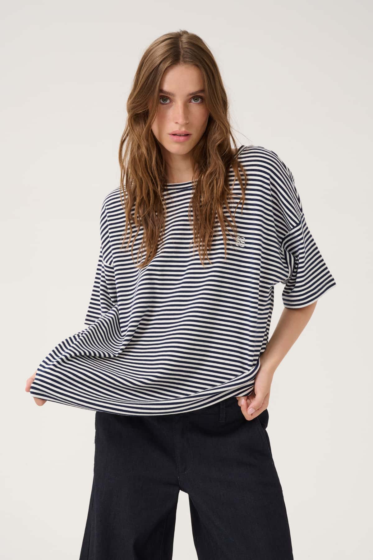 Navy and white stripe oversized Tshirt, with open round neck and embroidered logo on the front.