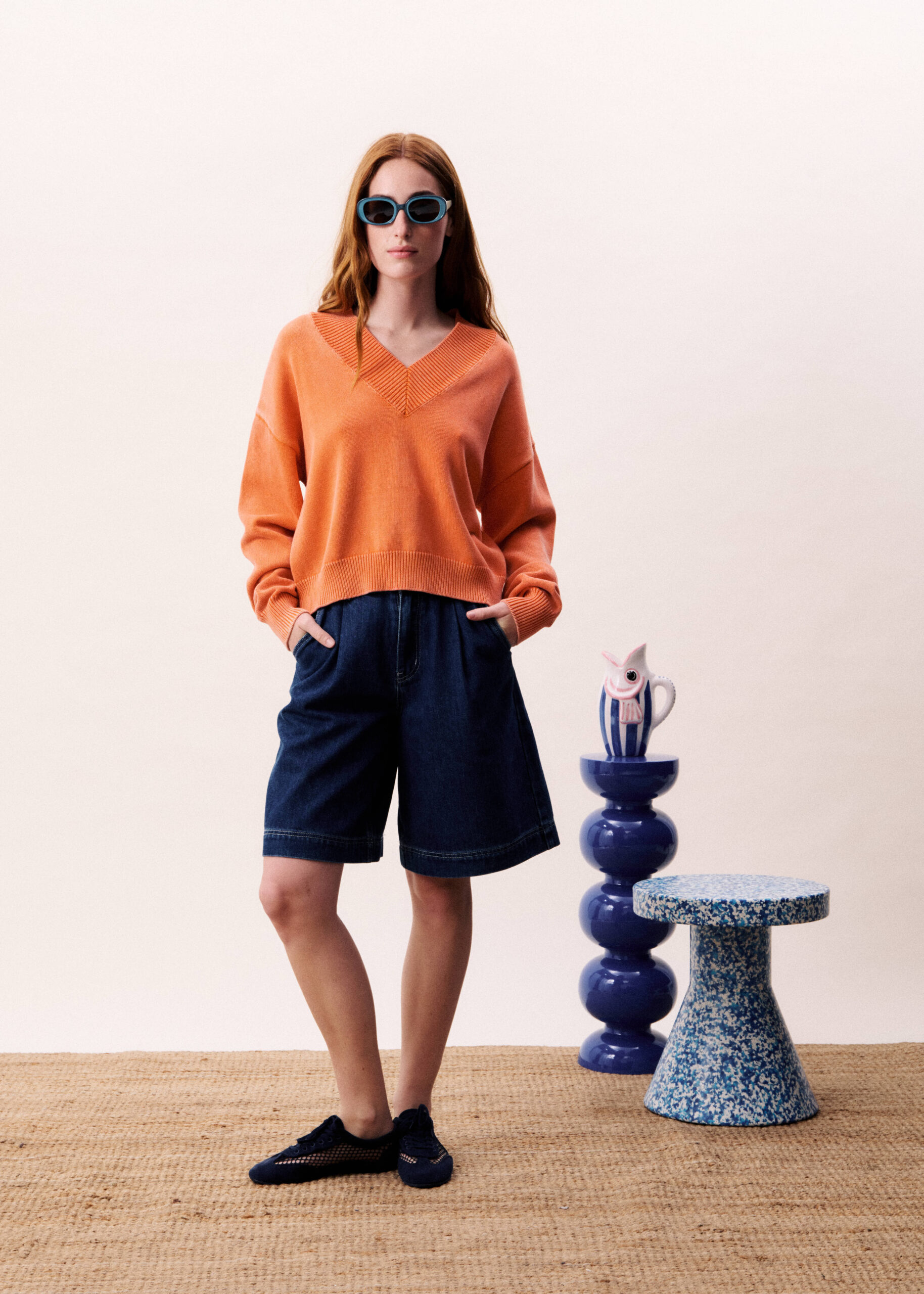 100% Cotton vibrant orange v-neck knit jumper with long sleeves and flower logo on the back of the neck.