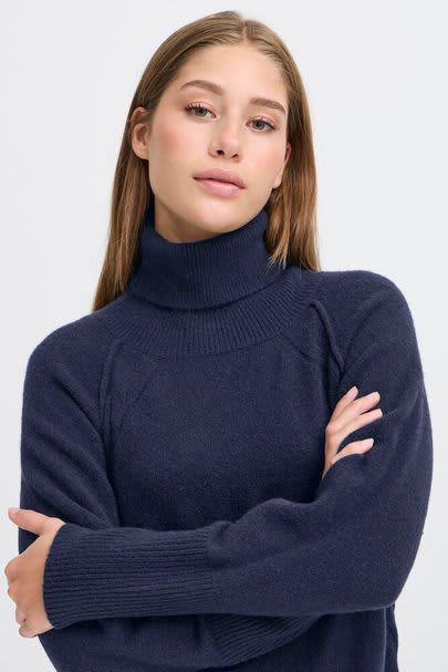 Turtleneck navy sweater dress offers a relaxed fit and cozy comfort. Features long sleeves, midi length, ribbed neck and cuffs, ideal for versatile styling. This dress also displays a beautiful cable knit detail down the sides coming from the front of the neck.