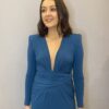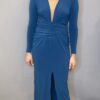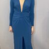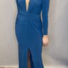 This teal maxi dress is so simple and chic. It is a fitted long sleeve dress with a zip fastening at the back and padded shoulders. It also has a knot detail at the front to give you a flattering shape whilst the material has a lovely stretch for comfort. This dress features a slit also to reveal a bit of leg. Perfect for an Autumn/Winter wedding.