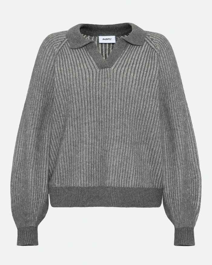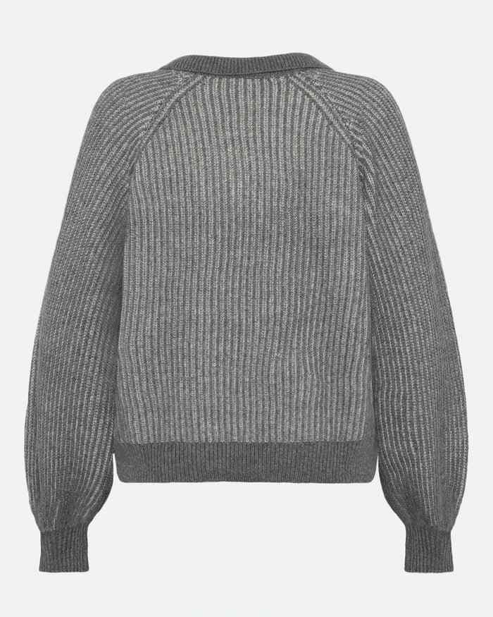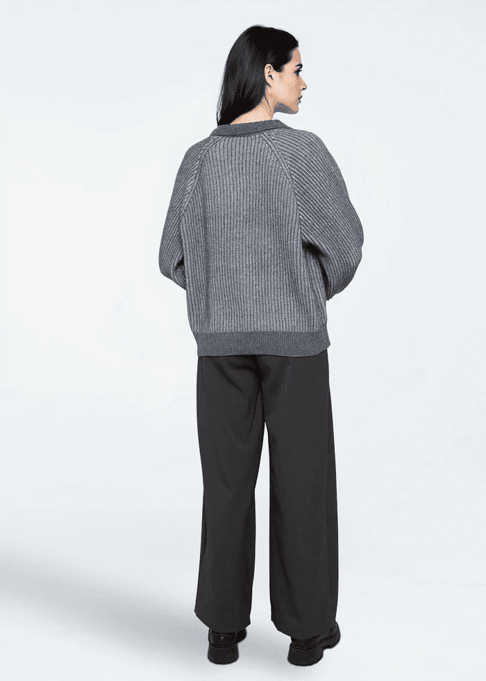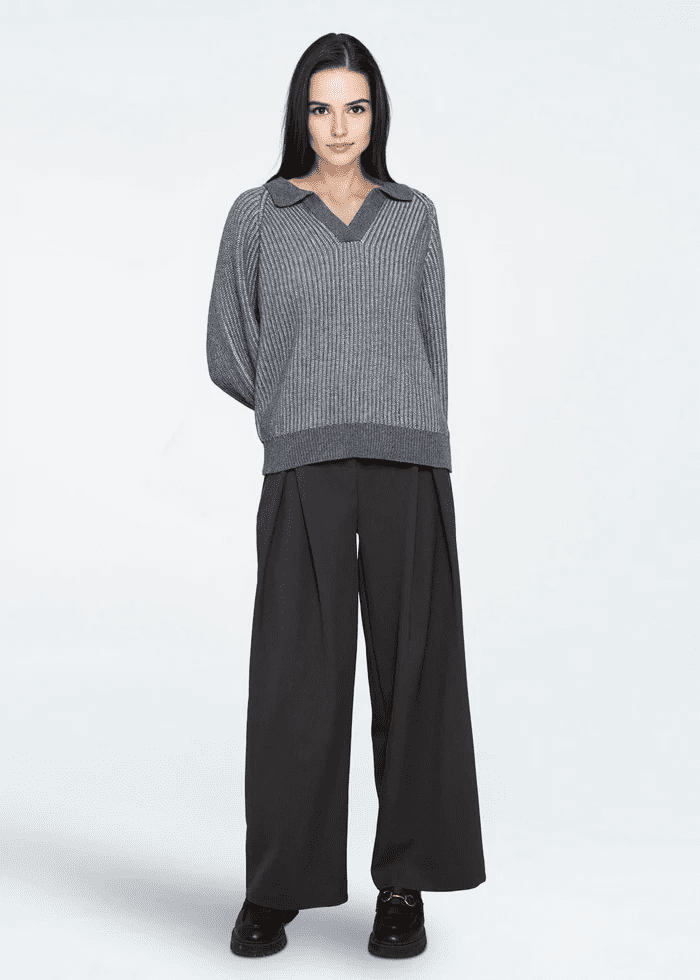 An elevated basic knit for your upcoming autumn/winter wardrobe. Grey & cream stripe effect knit with neat collar detail and V neckline.