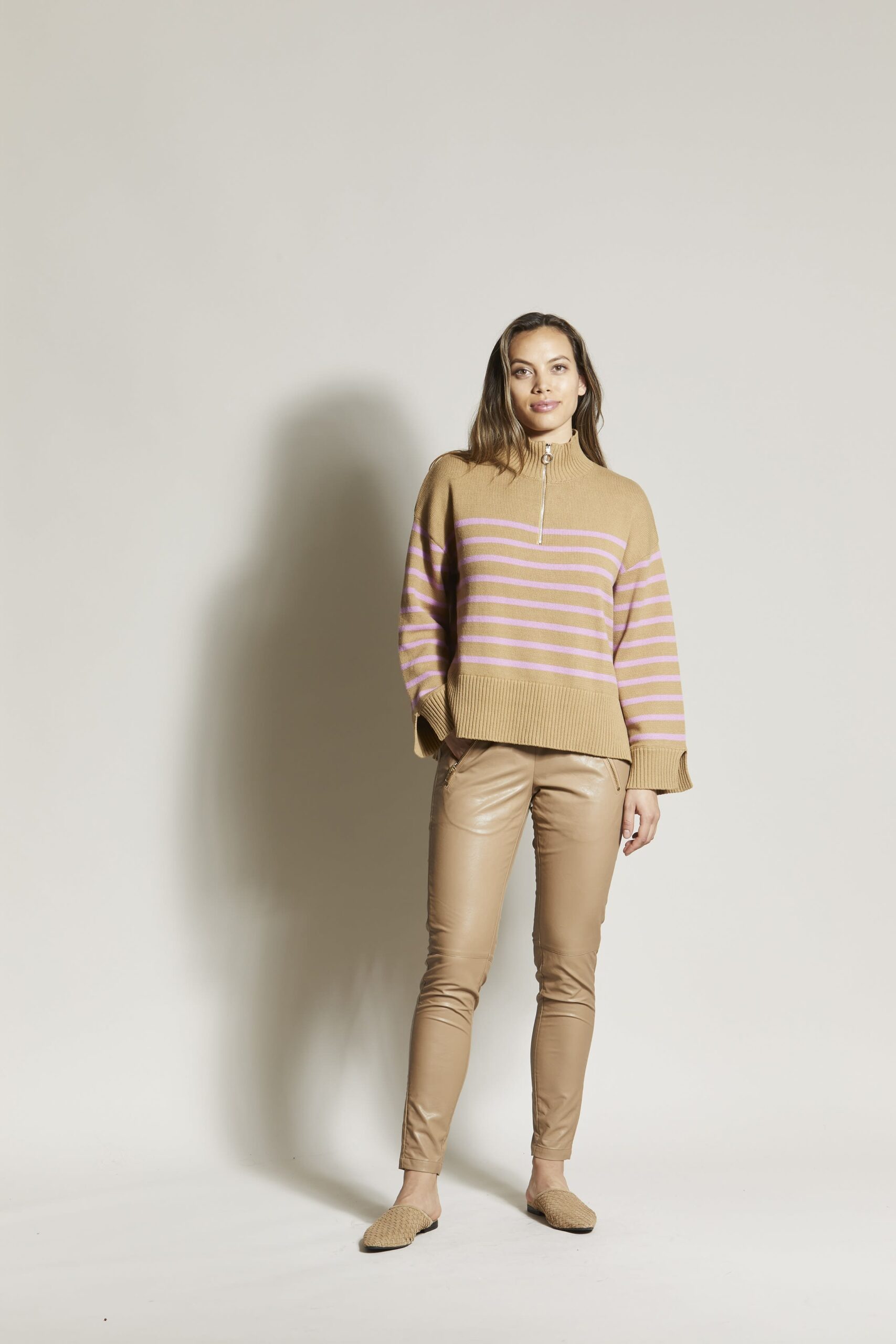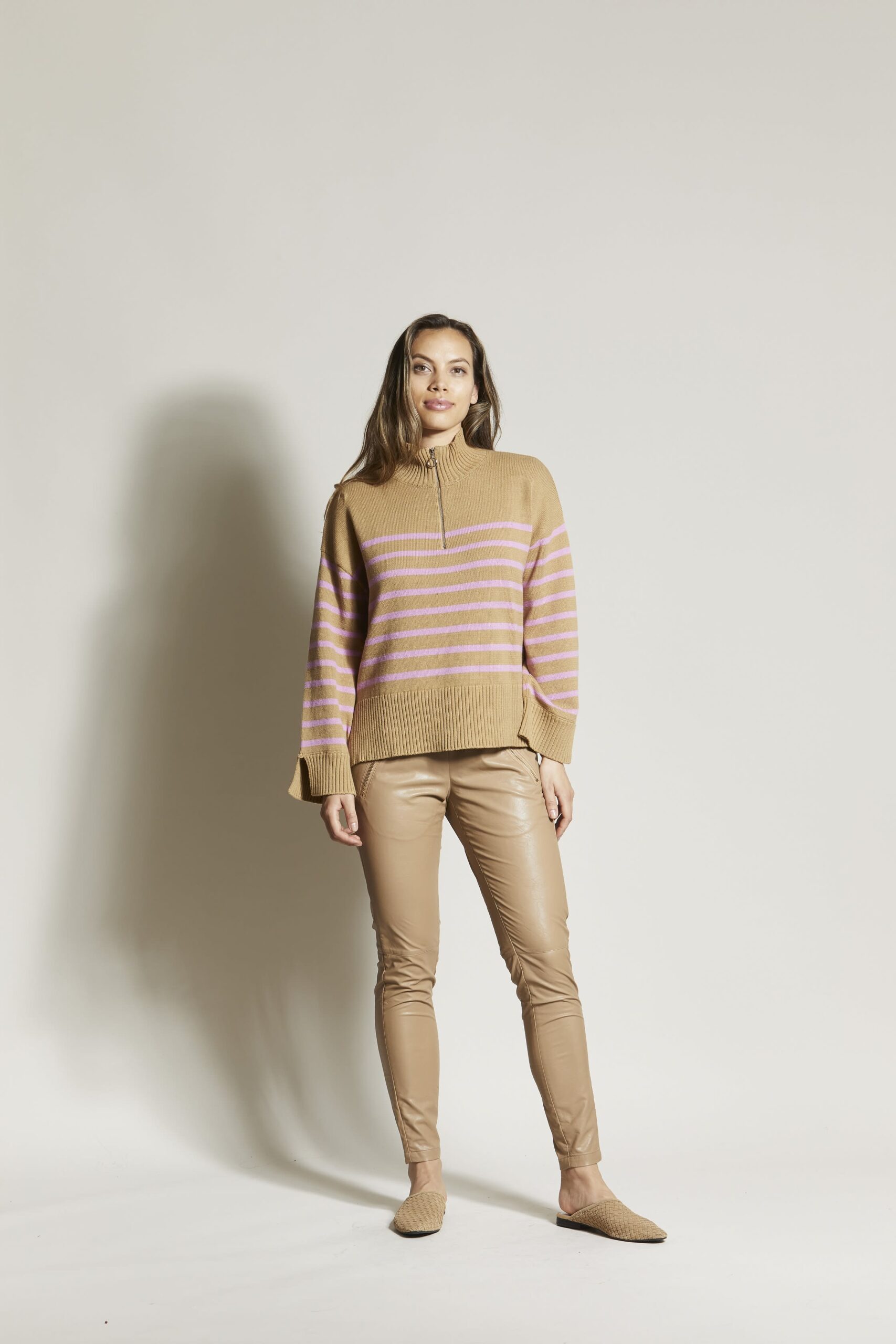 The most trendy cotton knit of the season from Rue de femme. A striped knit in beige and pink striped, with  zipper at the collar, slit in the sleeves and at the sides.