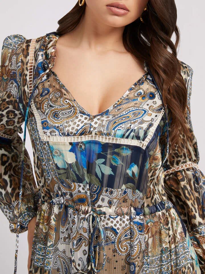 V Neck with bow, long Sleeves. Elasticated waistband with drawstring fastening. Patchwork print all over. Belted. Crochet details.