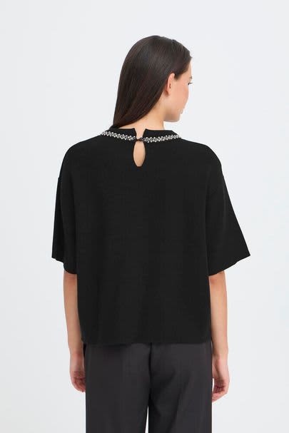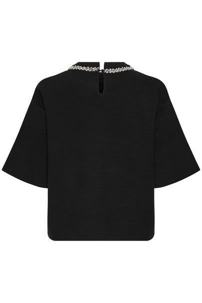 Boxy short sleeve top features a chic jewel-embellished neckline with subtle notched detail. The structured silhouette and soft finish add a refined modern edge to any look.