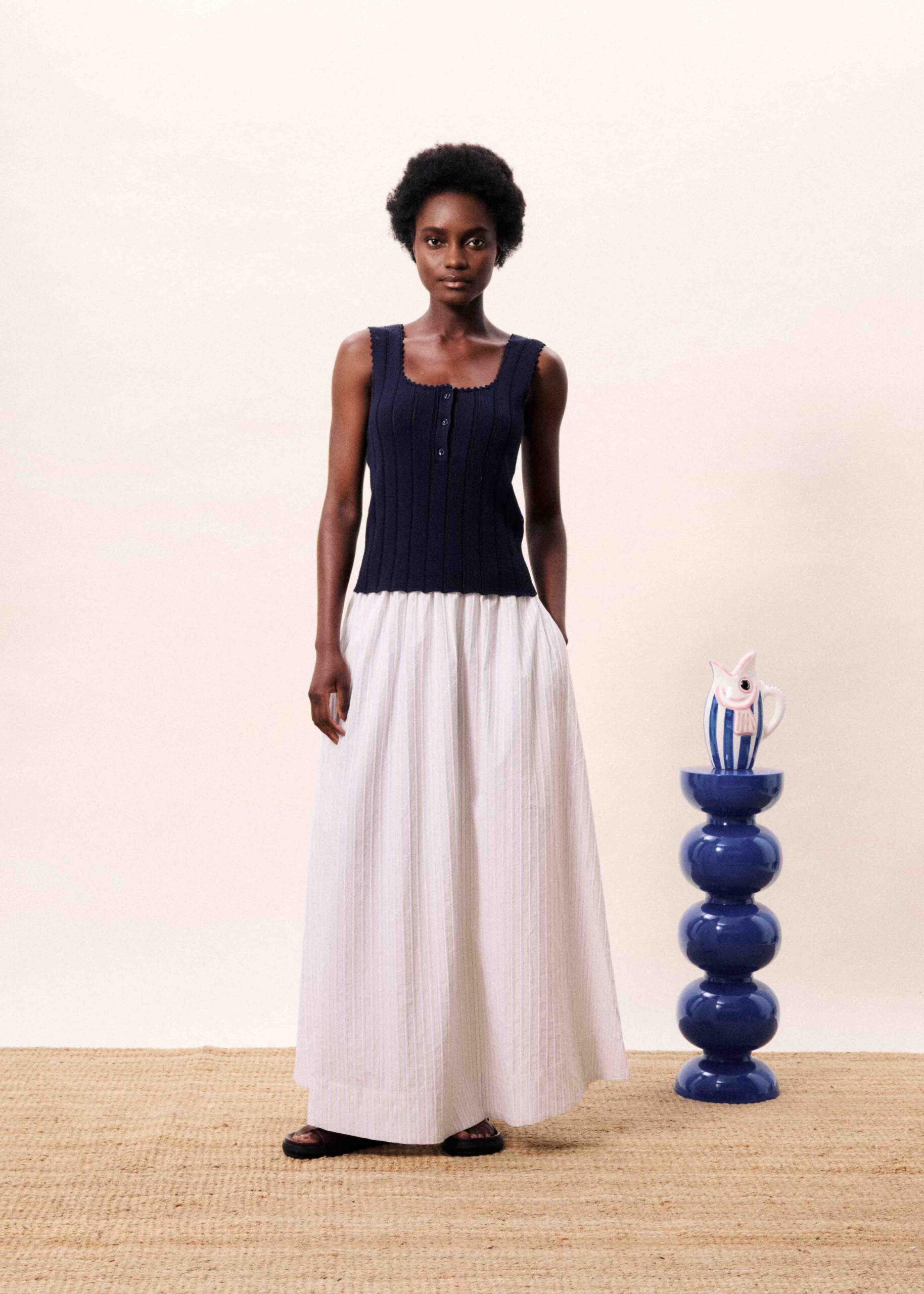 Ribbed knit tank top with central button fastening and scalloped trim.