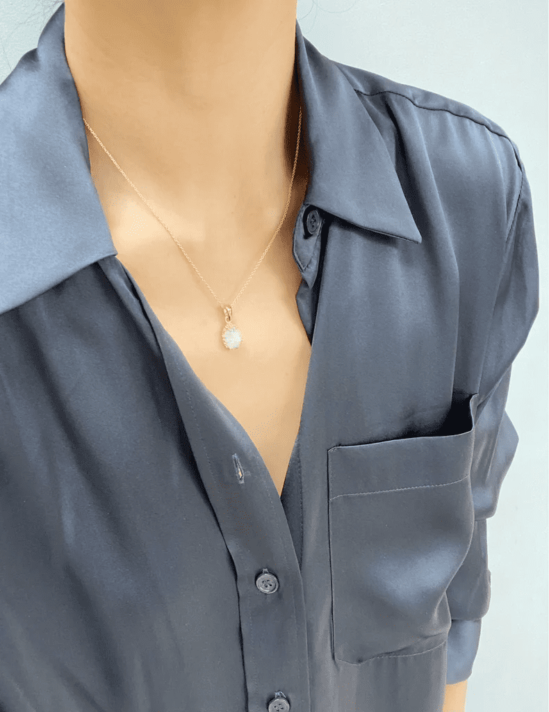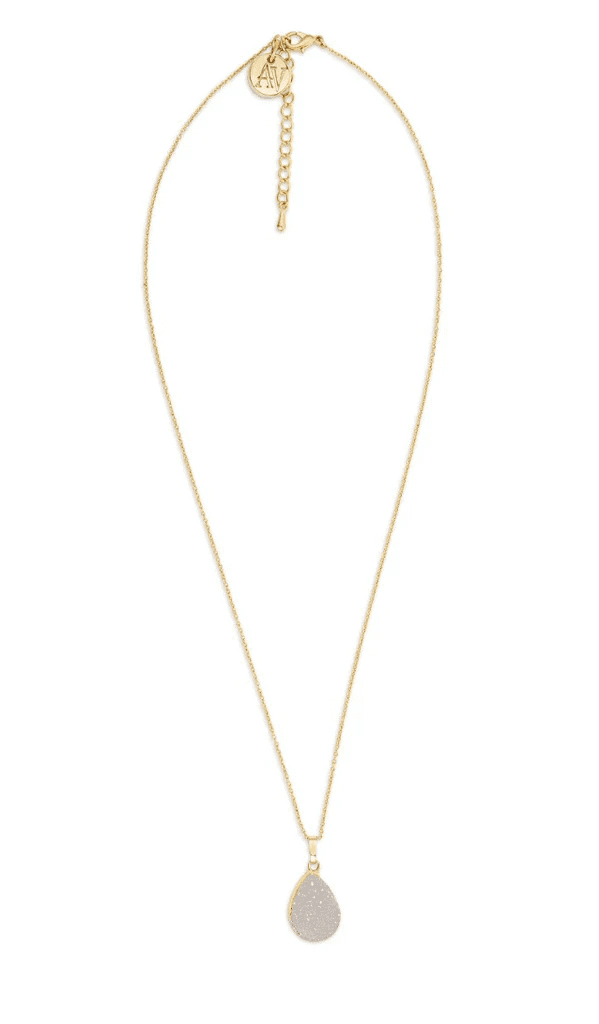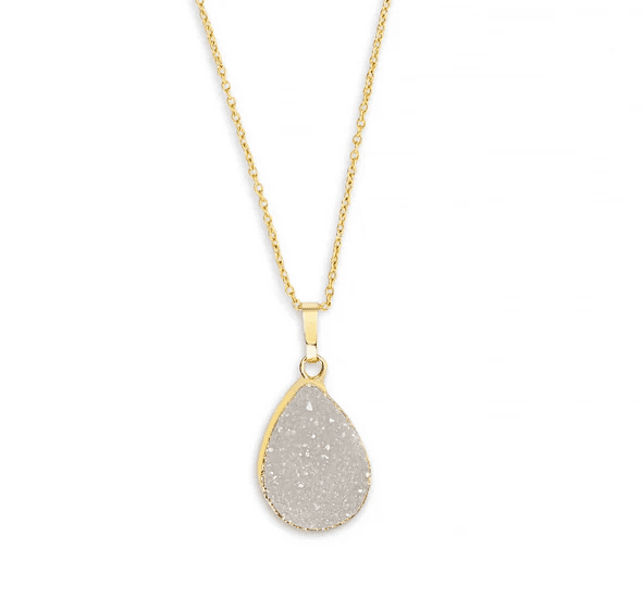 Eiran necklace is a perfect piece for layering and for when you just want something simple yet eye catching. AB light grey Druze pendant will change colour from very light grey to white depending on the light and with movement. Eira is set on gold plated faceted chain. Adjustable length.